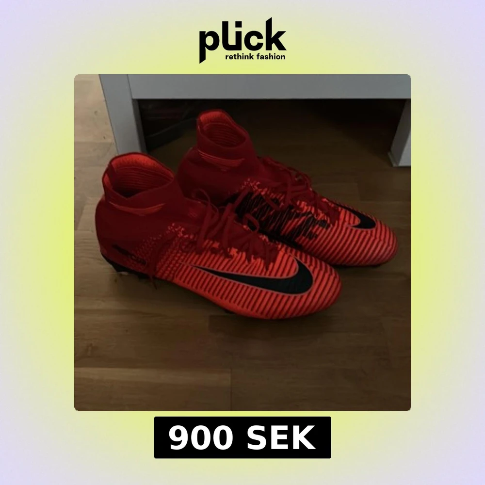 Säljer ett par riktigt snygga röda Nike fotbollsskor med svarta detaljer och coolt randigt mönster. Skorna har högre skaft för extra stöd, snörning och plös med Nike-logga. Perfekta för dig som vill sticka ut på planen. Vid fundering hör av dig// Kalle