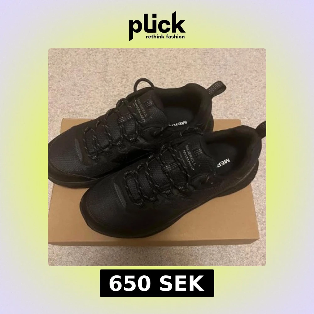 Säljer ett par svart sneakers från Merrell. Skorna har en robust design med snörning och en slitstark sula, perfekt för utomhusaktiviteter. De är helt svart och har en bekväm passform. Skorna har bara använts 1 gång.