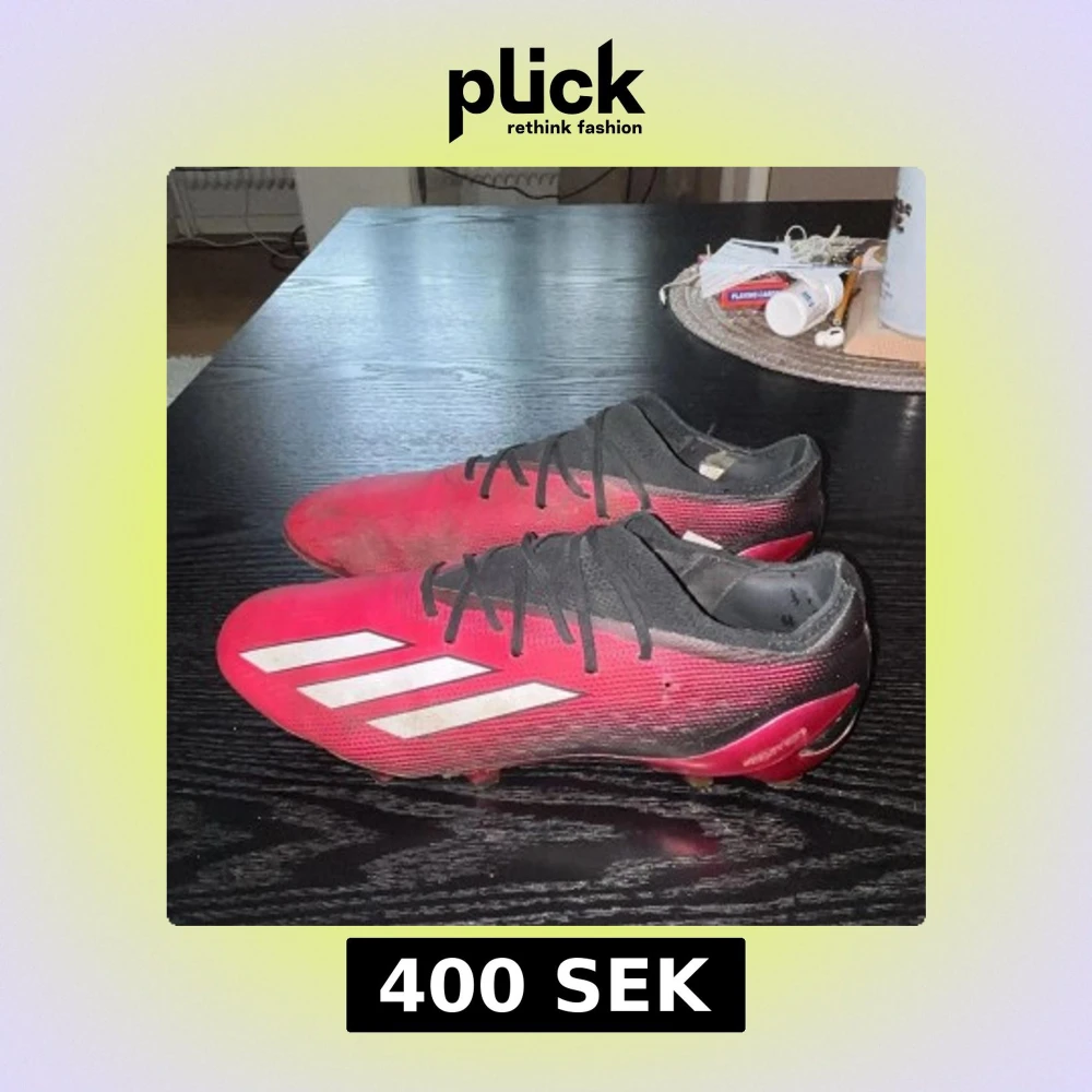 Säljer ett par rösa fotbollsskor från Adidas med svarta och vita detaljer. Skorna har snörning och en modern design med tre vita ränder på sidan. Perfekta för fotbollsplanen med en slitstark sula. Modell adidas speedportal .1 alltså högsta modellen. Storlek 42