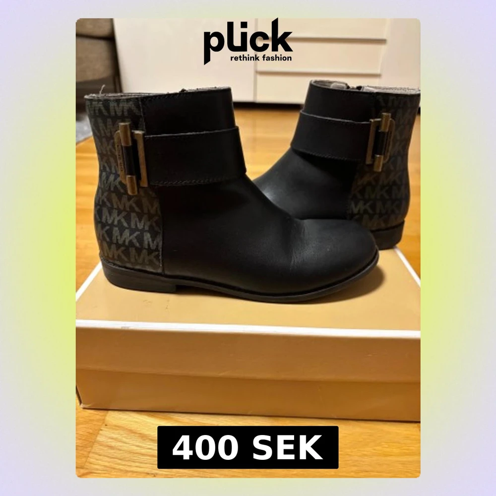Två olika dragkedjor på skorna då den ena gick sönder (se bild 5). Snygga svarta boots från Michael Kors med MK-logga i mönster på hälen och sidorna. Storlek 33.