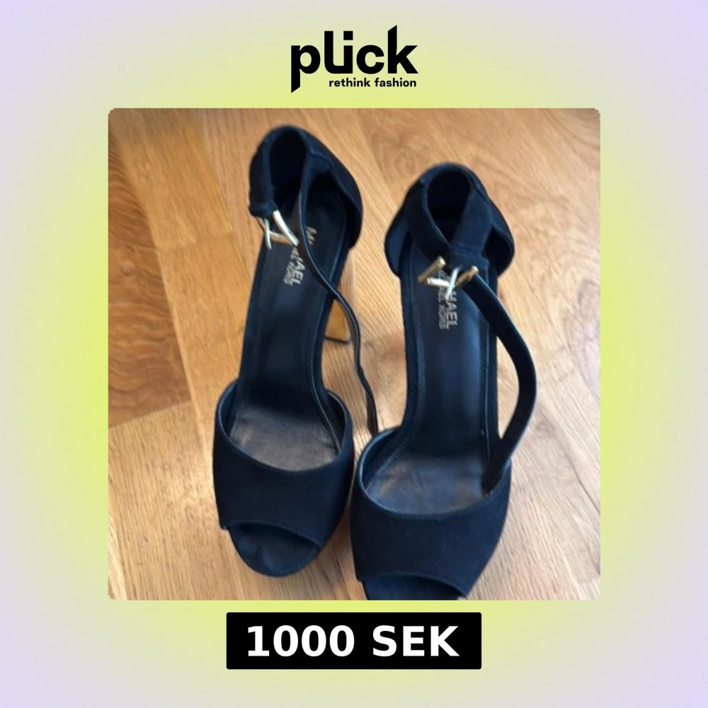 Säljer ett par svarta klackskor från Michael Kors med öppen tå och bred klack i guldig färg. Skorna har en elegant design med rem över foten och spänne i guld. Perfekta för dig som vill ha en stilren och lyxig look.