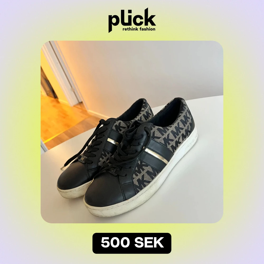 Snygga svarta sneakers från Michael Kors med deras ikoniska logotypmönster. Skorna har snörning och en vit sula som ger en fräsch look. Perfekta för både vardag och festliga tillfällen. De är i bra skick och redo för nya äventyr!