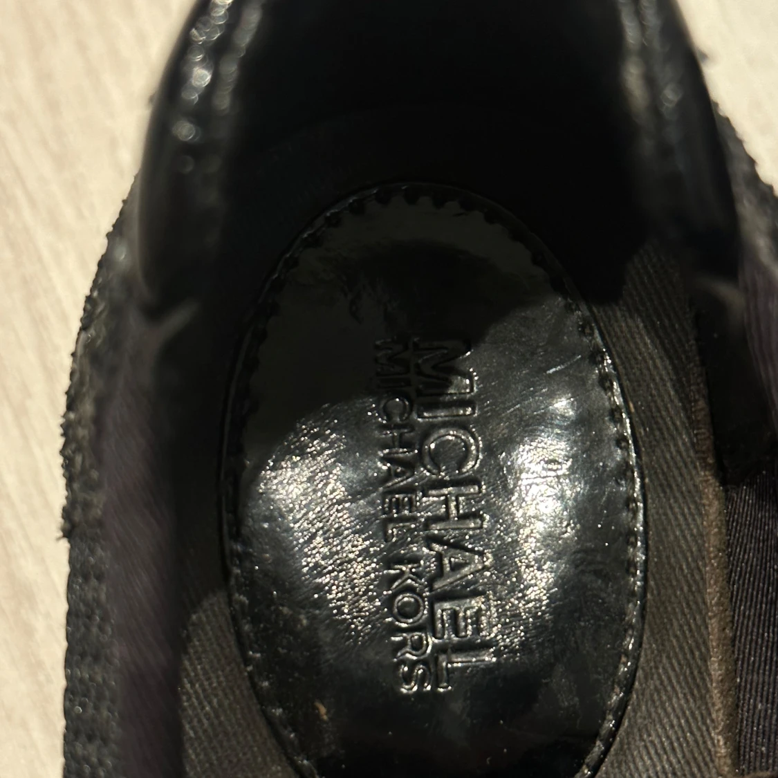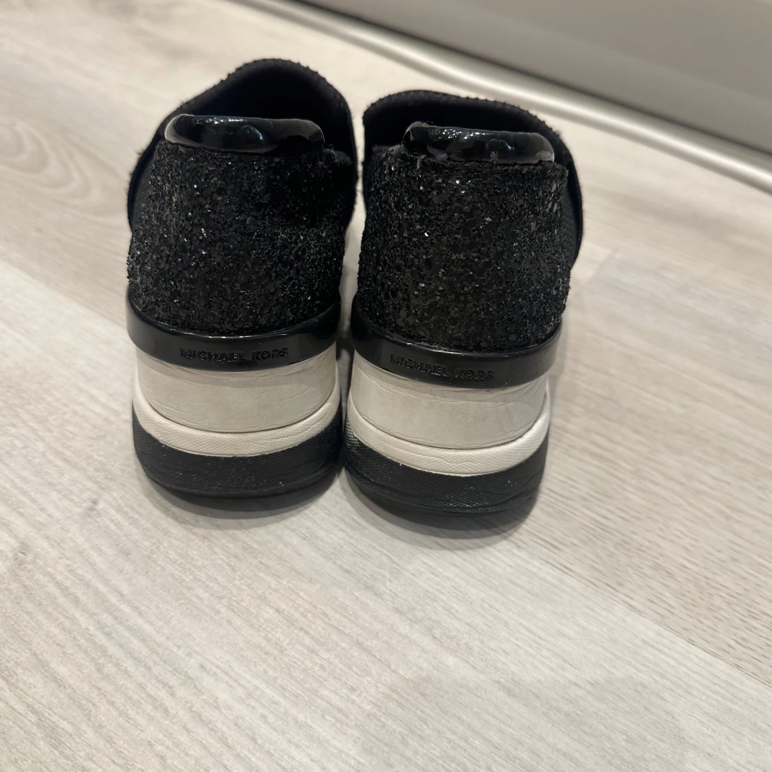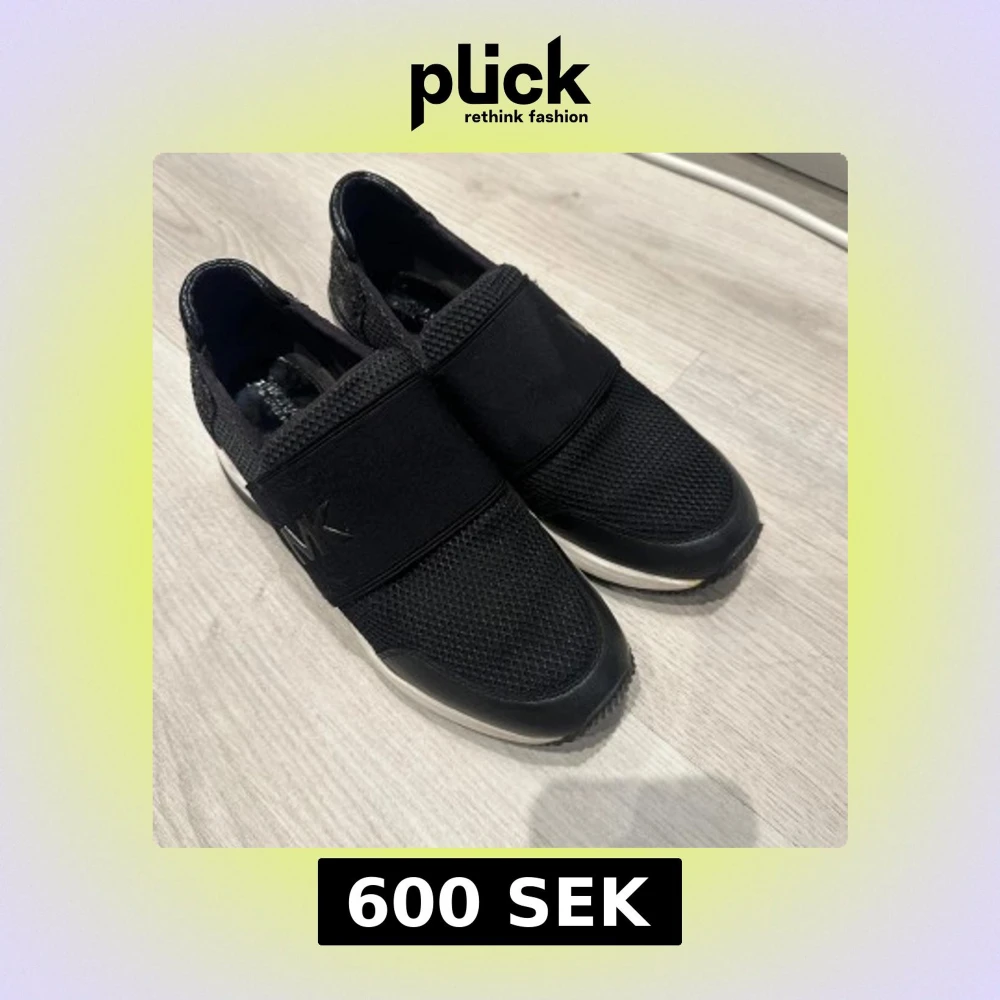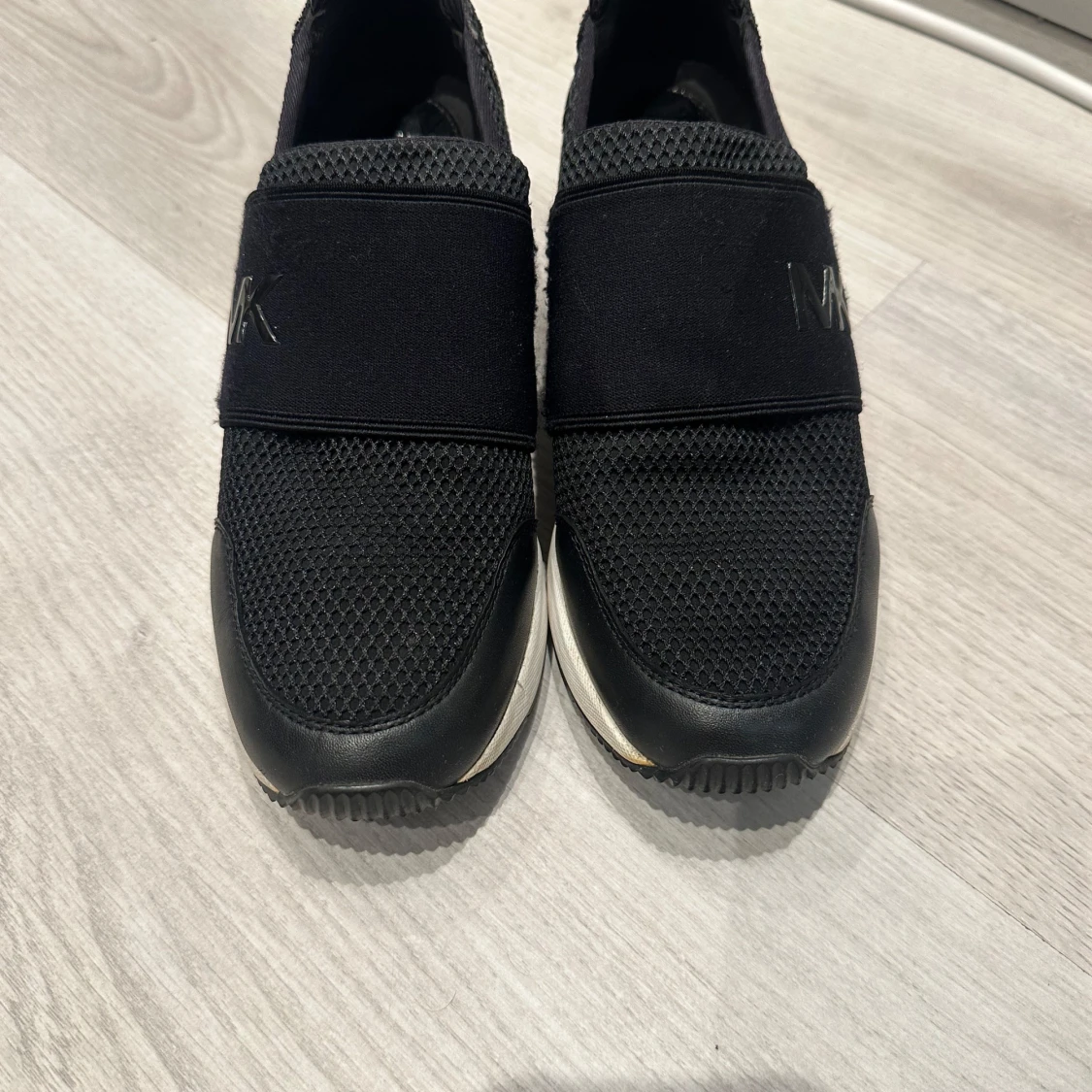 Snygga svarta sneakers från Michael Kors med elastiska band och nätmaterial. Skorna har en diskret logga på sidan och en glittrig häl.