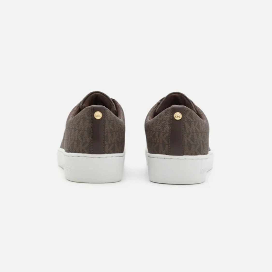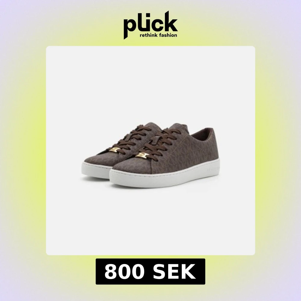 Snygga bruna sneakers från Michael Kors med monogrammönster och gulddetaljer. Skorna har en vit sula och snörning framtill. Perfekta för en stilren look.