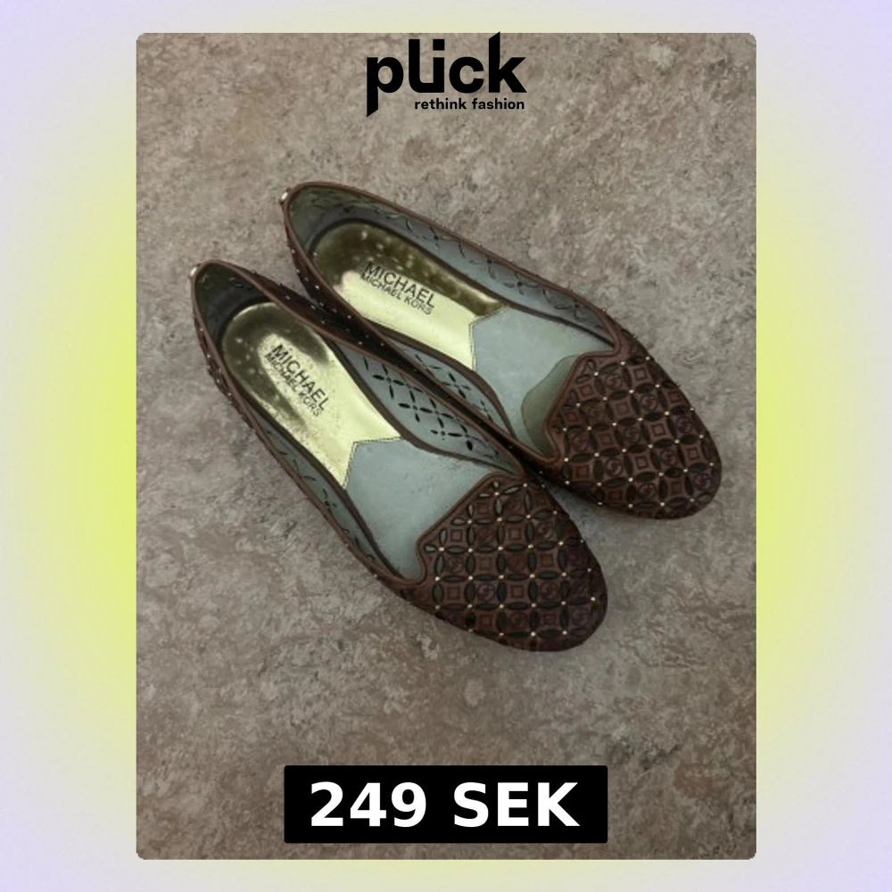 Snygga bruna ballerinas från Michael Kors med utstansat mönster och guldfärgade nitar. Skorna har rund tå och är tillverkade i skinn med dekorativa detaljer över hela ovandelen. Perfekta för dig som vill ha något unikt och stilrent.
