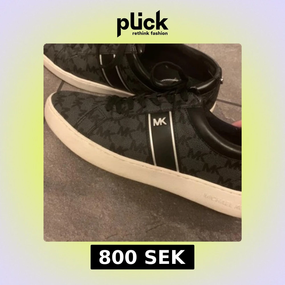 Snygga svarta sneakers från Michael Kors med ett diskret mönster och märkets logga på sidan. Skorna har en vit sula och snörning framtill. Perfekta för en stilren look.