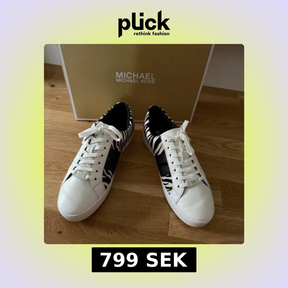Snygga sneakers från Michael Kors med zebramönstrade paneler i svart och vitt. Skorna har vita snören, vit sula och svarta detaljer på sidan. Perfekta för dig som vill sticka ut med ett djurinspirerat mönster och exklusiv känsla.