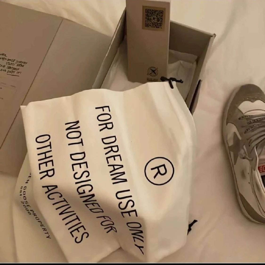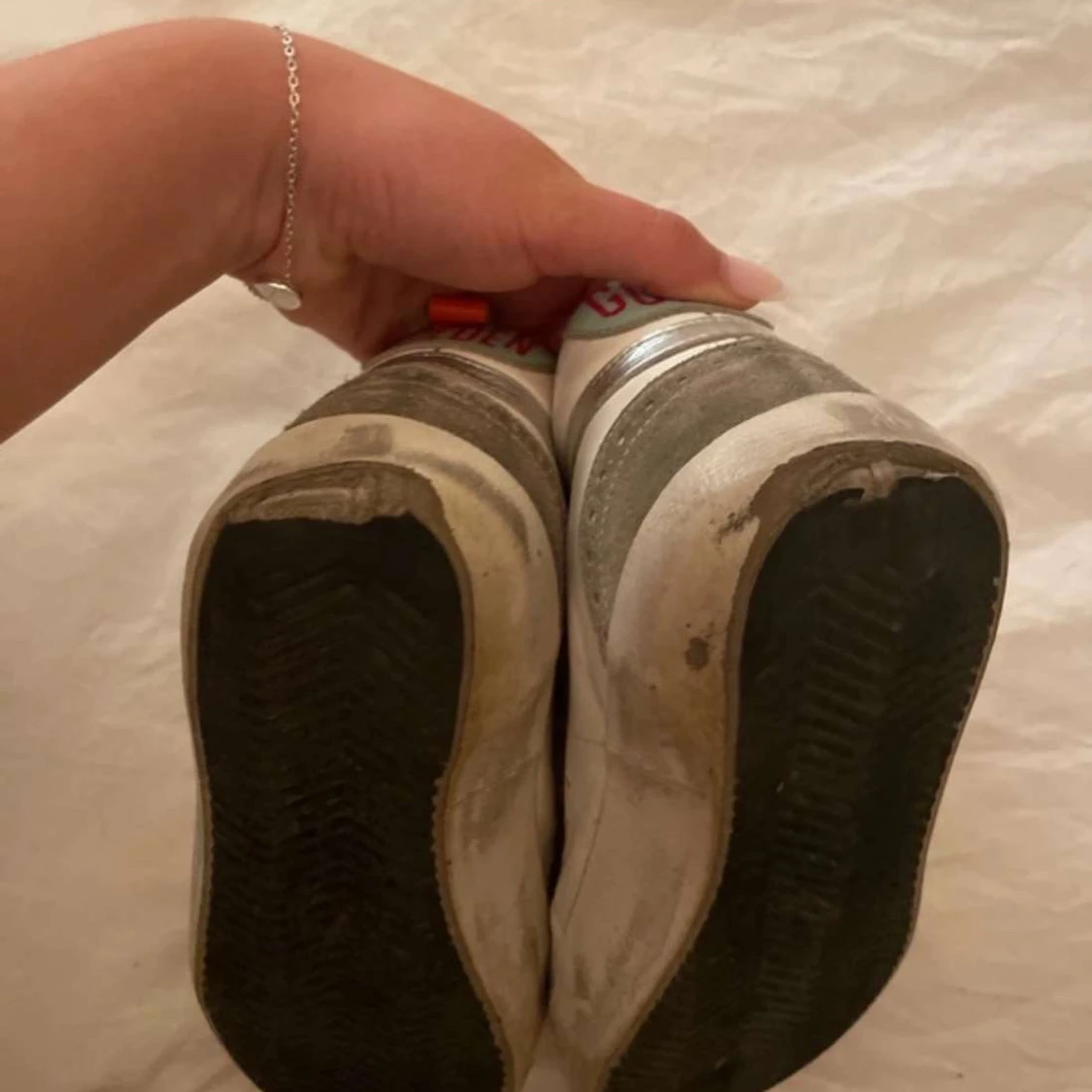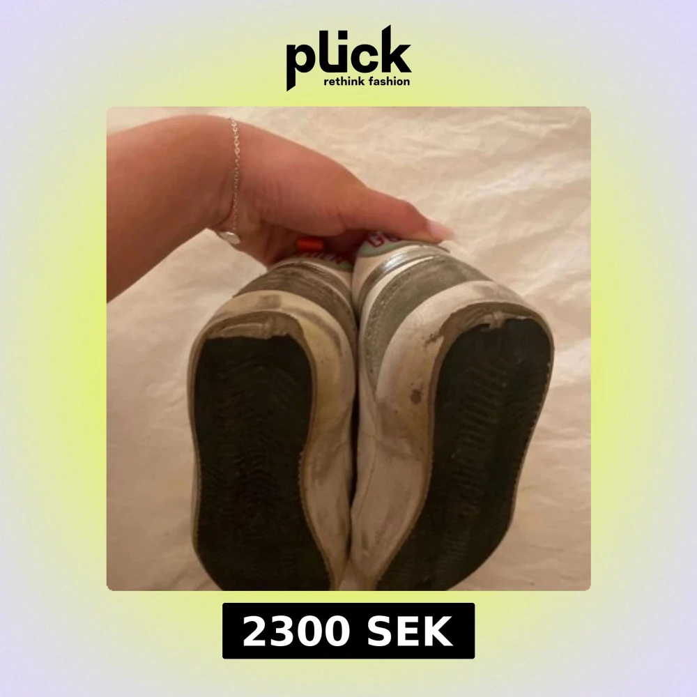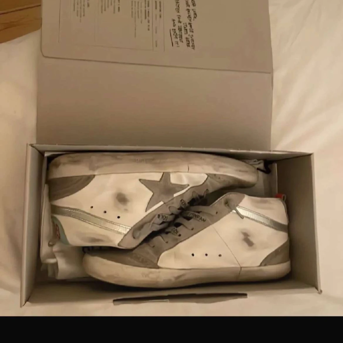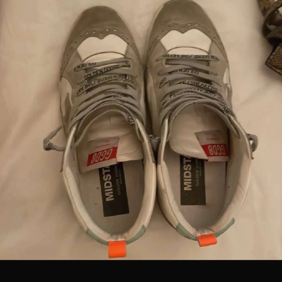 Säljer ett par Golden Goose Mid Star åt min tjej i vitt och grått med silverdetaljer och stjärna på sidan. Skorna har snörning med text på skosnörena, ljusblå hälkappa med röd 'GOLDEN'-text och orange flärp. Ovandel i skinn och mocka, platt sula och rund tå. Bilderna kan se lite dåliga ut men skriv till mig om ni vill ha några fler eller undrar över något