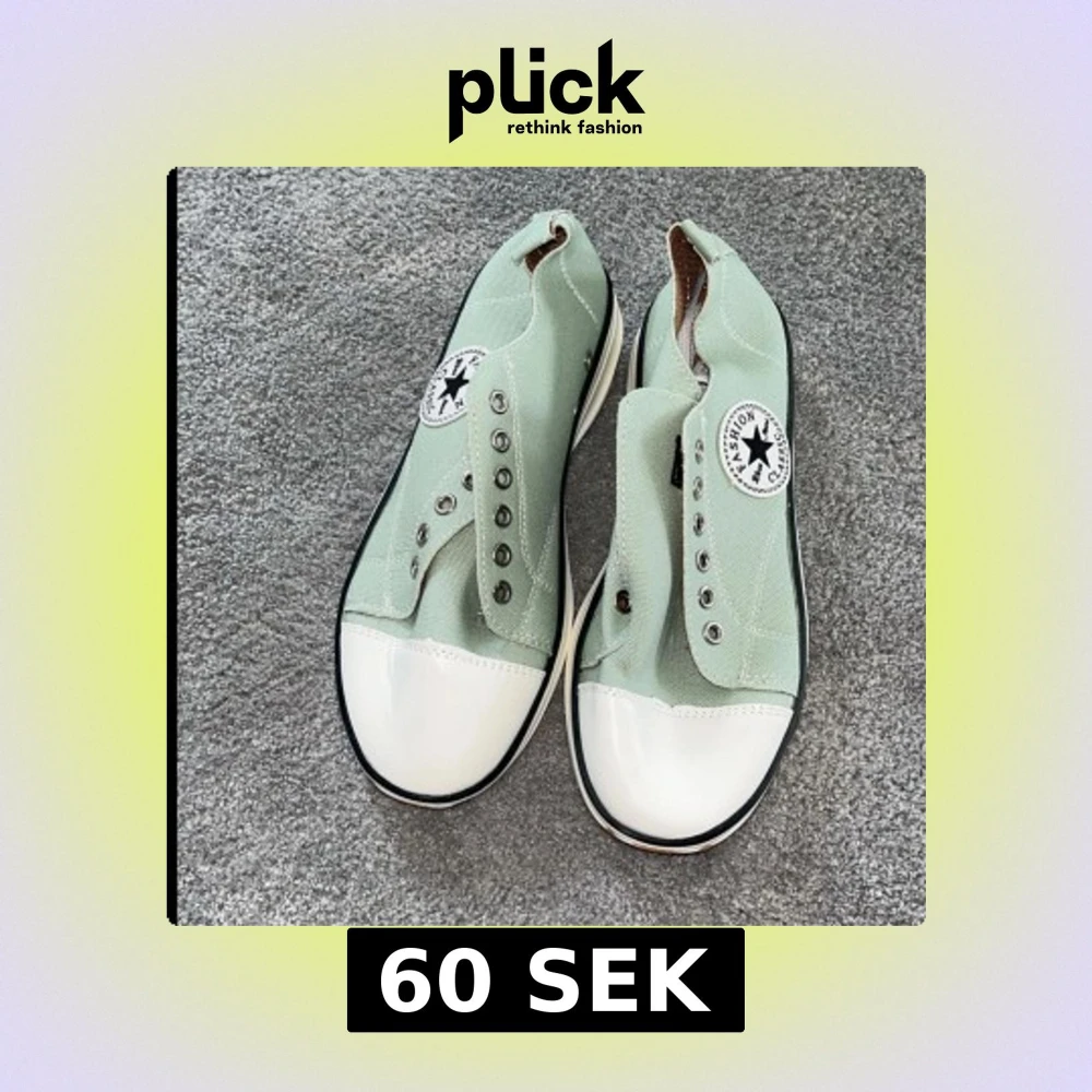 Snygga mintgröna sneakers med vit tå och svart/vit sula. Skorna har klassisk rund tå, metallöljetter för snörning och tygpatch på sidan. Perfekta för dig som gillar en clean och stilren look med retrovibbar. Aldrig använda