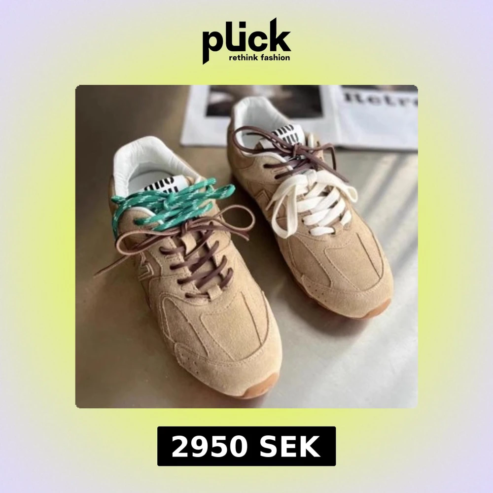 (35-44) Snygga sneakers från Miu Miu i beige mocka med kontrasterande snörning i grönt, vitt och brunt. Modellen har rund tå, platt sula och vita detaljer på plösen med Miu Miu-logga. Finns även i grått och mörkbrunt med olika färger på snörena. Perfekt för dig som gillar att sticka ut med dina skor.