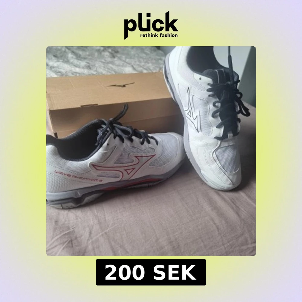 Snygga Mizuno Wave Phantom 3 sneakers i vitt med svarta och röda detaljer. Skorna har svart snörning, meshpaneler för andning och en slitstark sula med rött inslag. Perfekta för träning eller sport. Klassisk Mizuno-logga på sidan och häl. Lätt använda men inga skador