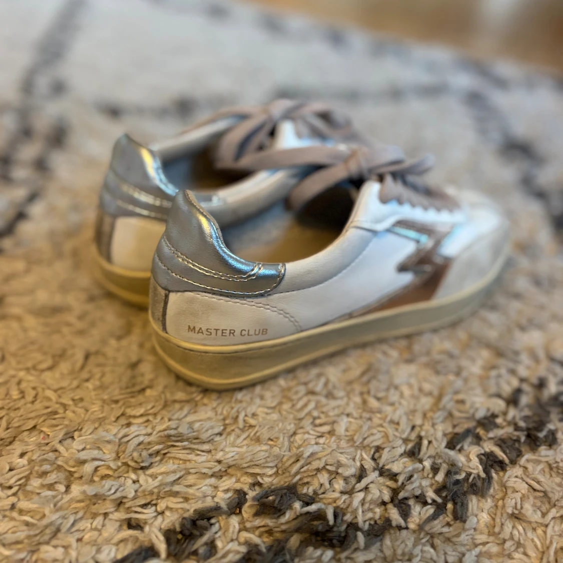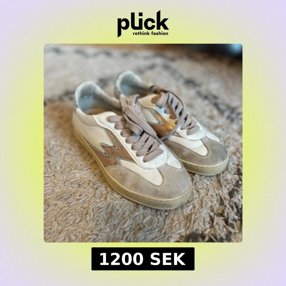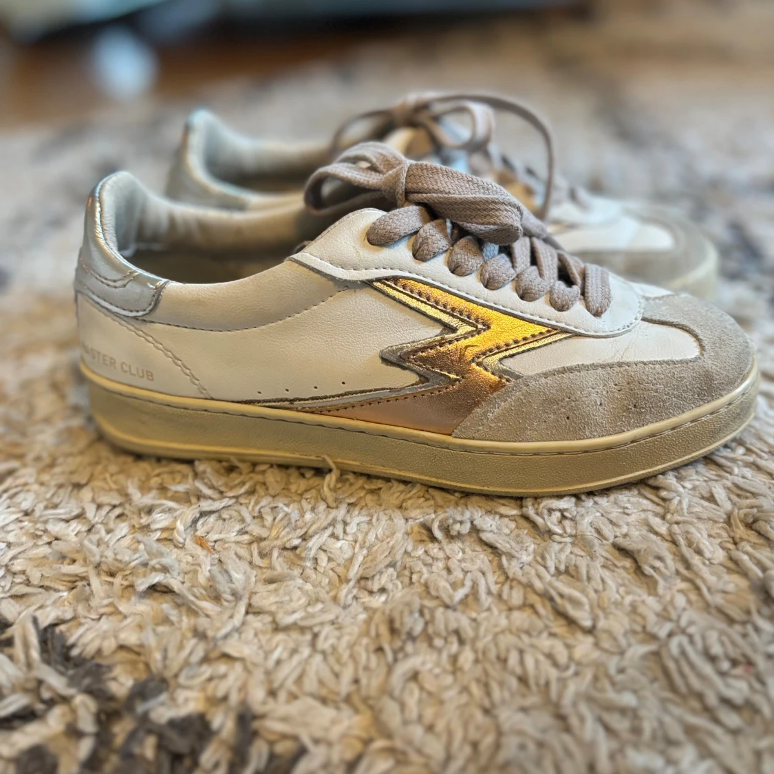 Snygga sneakers från Moaconcept i vitt och beige med metallic guld-blixt på sidan. Skorna har rund tå, platt sula och snörning. Ovandelen är i skinn och mocka, med silverfärgad häl. Perfekta för dig som gillar retrovibbar och coola detaljer. Sparsamt andvända! Priset går att diskuteras🐬🐬