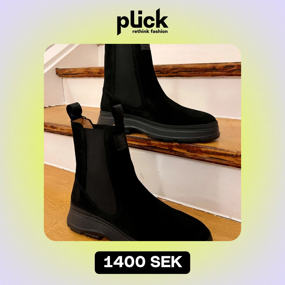 Snygga svarta Chelsea boots i mocka med en robust sula. Perfekta för höst och vinter, dessa boots har en klassisk design utan snörning, vilket gör dem lätta att ta på och av. De är i nytt skick och redo att ge din outfit en stilren touch.