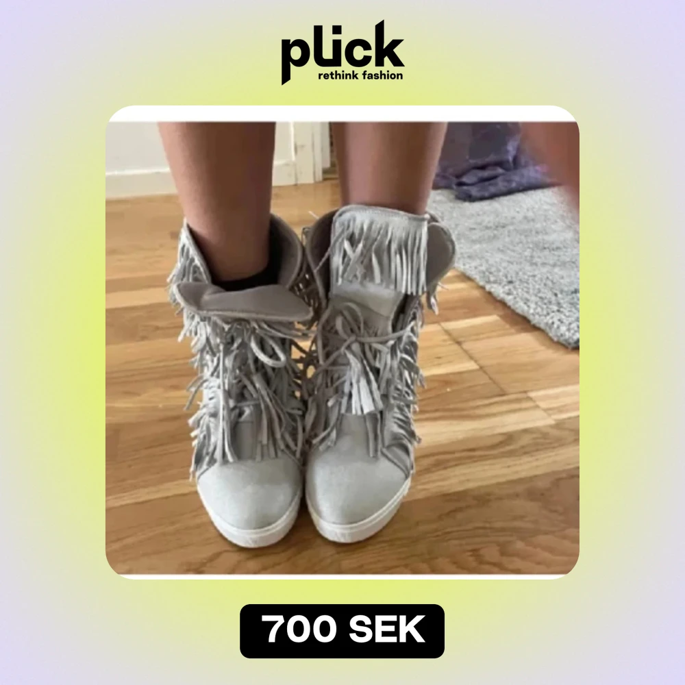 Säljer dessa gråa fransskor med kilklack i mocka material. PS första bilden är lånad.