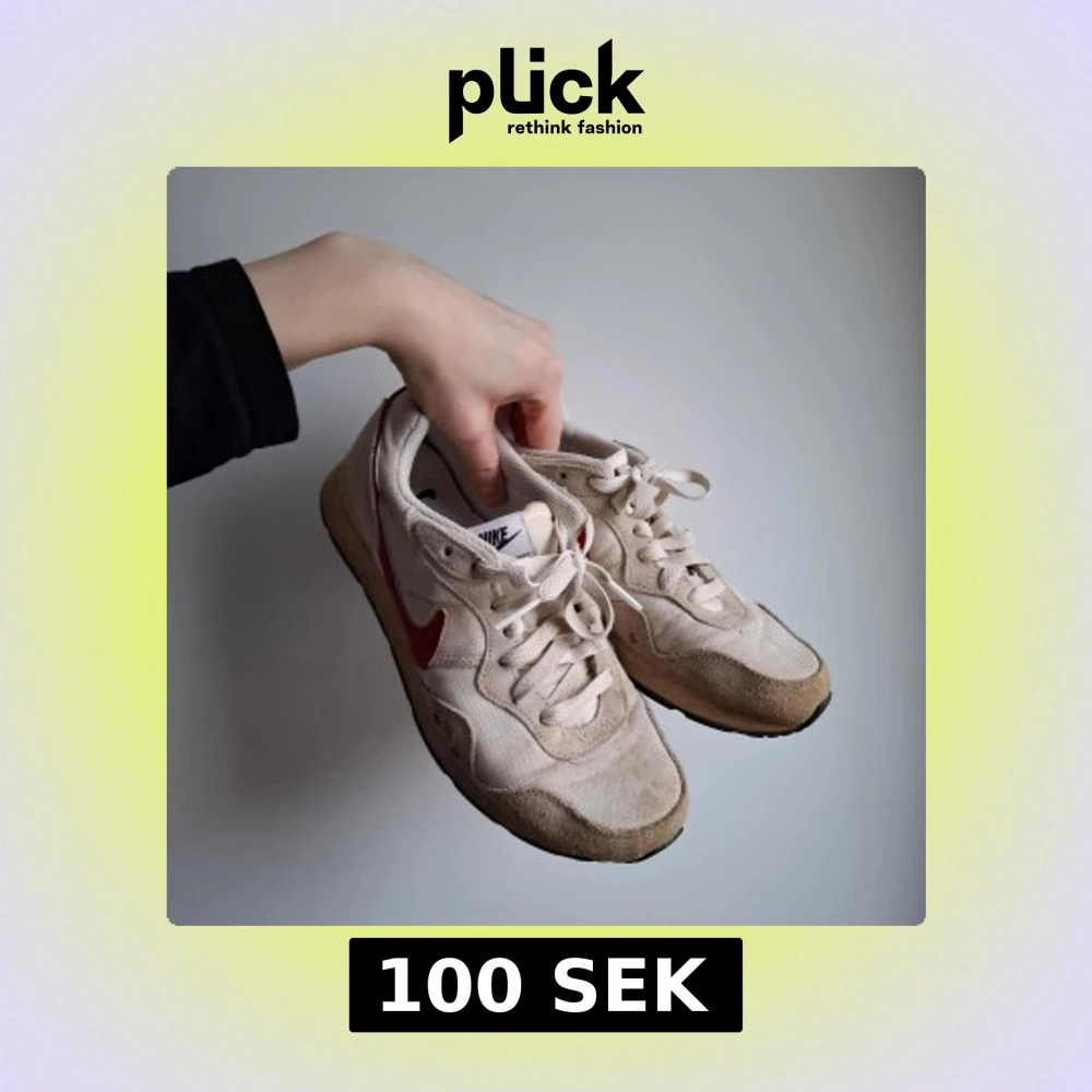 Snygga beige Nike sneakers med röd swoosh på sidorna. Ovandelen är i textil och mocka, med klassisk snörning och svart yttersula. Perfekta för dig som gillar retrostil och vill ha ett par unika skor i garderoben.
