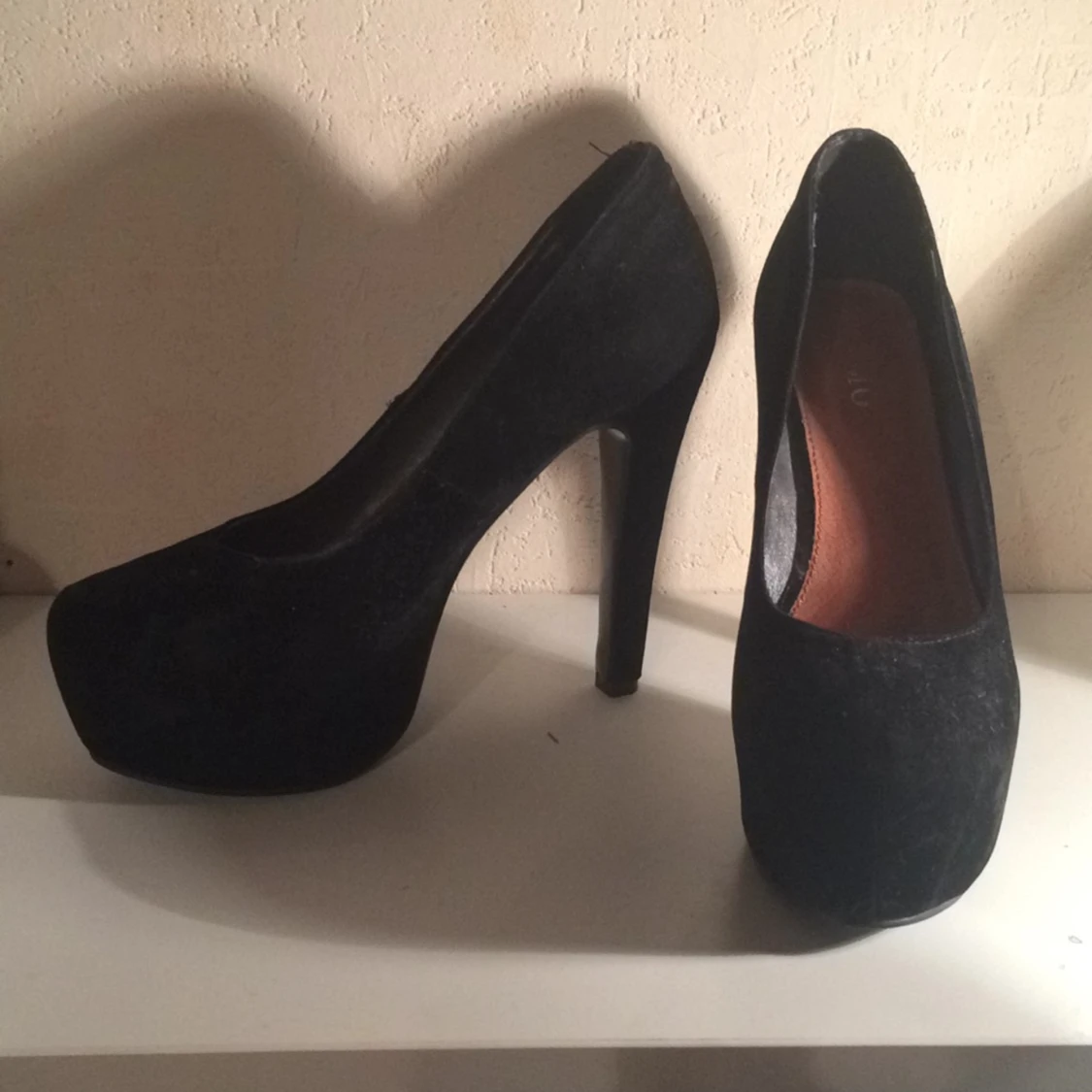 Endast använda en gång som balskor. Jättefina i mocka imitation och lättare att gå i då dem har platå😉 ca 10 cm höga