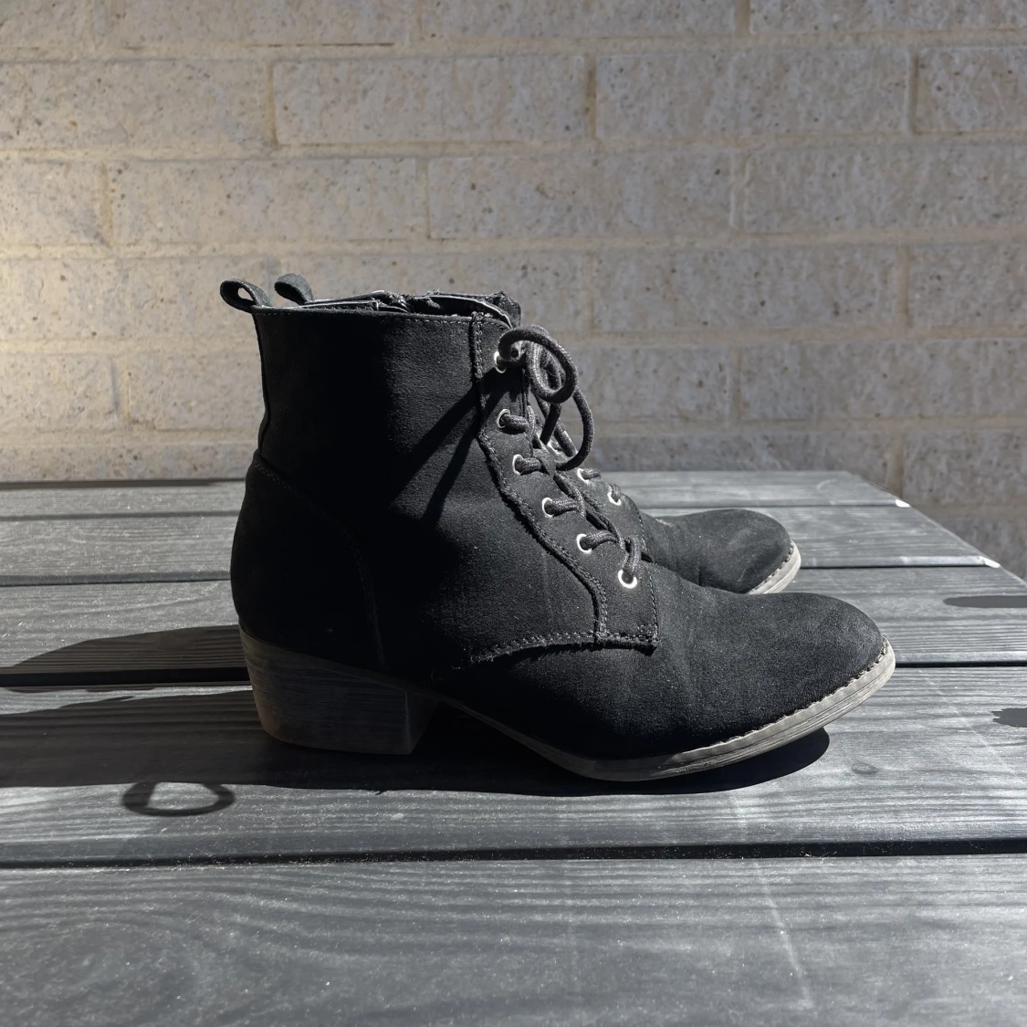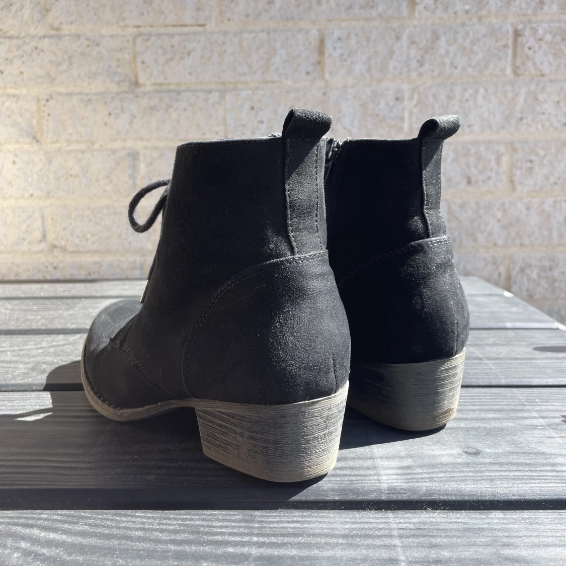 Boots i fuskmocka med snörning och klack. Använt skick. Det står inte men har för mig att märket är Graceland.