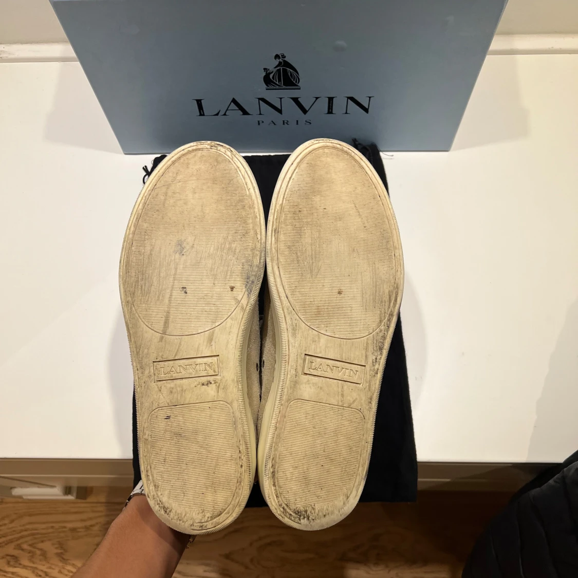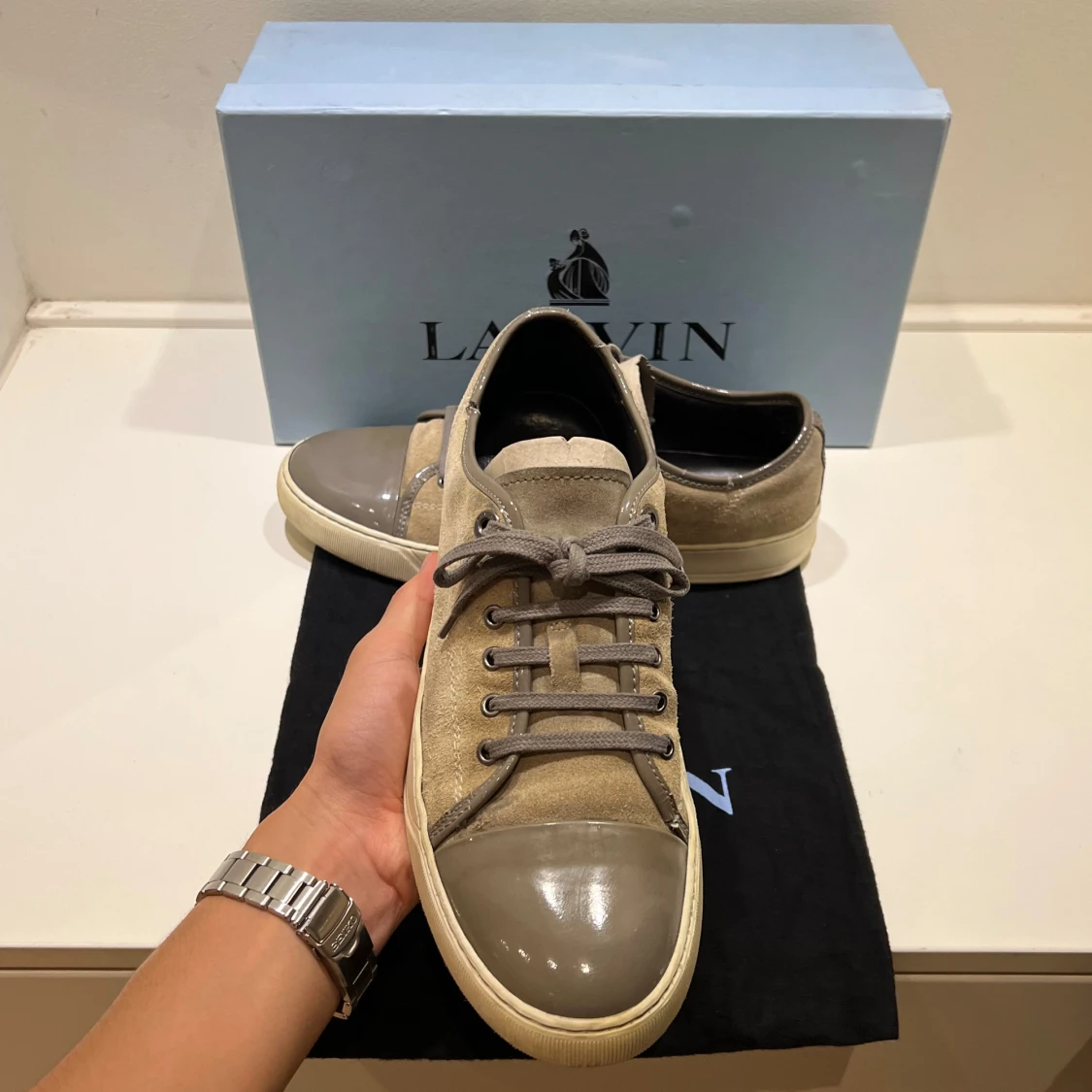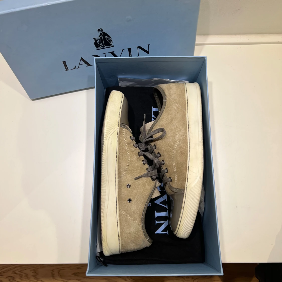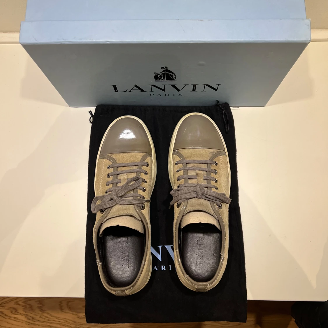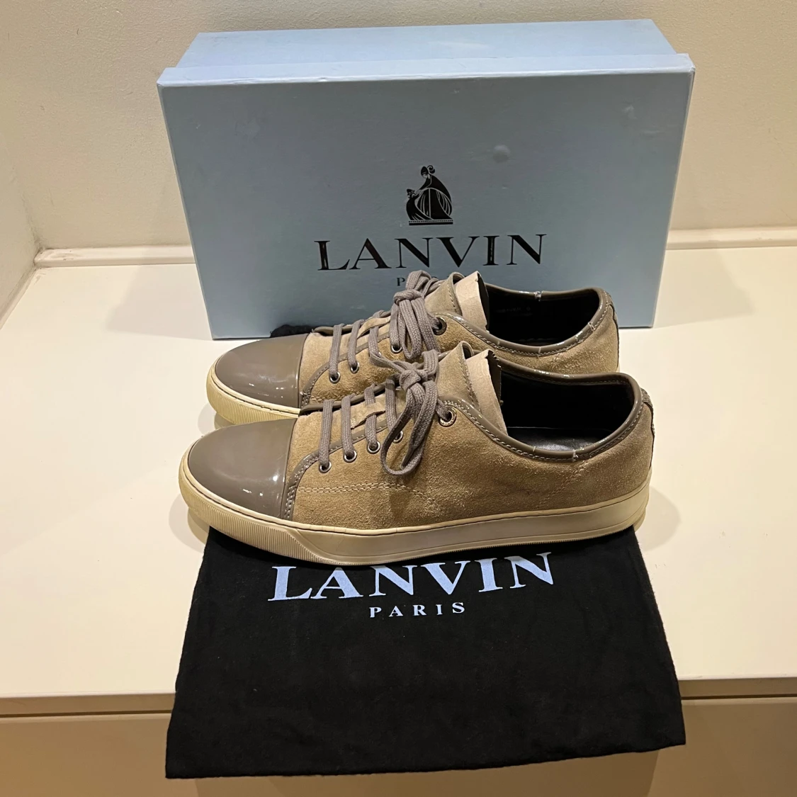 Snygga Lanvins i beige mocka, grå lackad toecap och grå snörning. Perfekta skor som kan bäras året runt. Sparsamt använda men med små repor på hälkragen. Storlek UK 8 = EU 42,5 - 43. Kommer med originalkartong och dustbag. Skriv vid minsta fundering!🙌