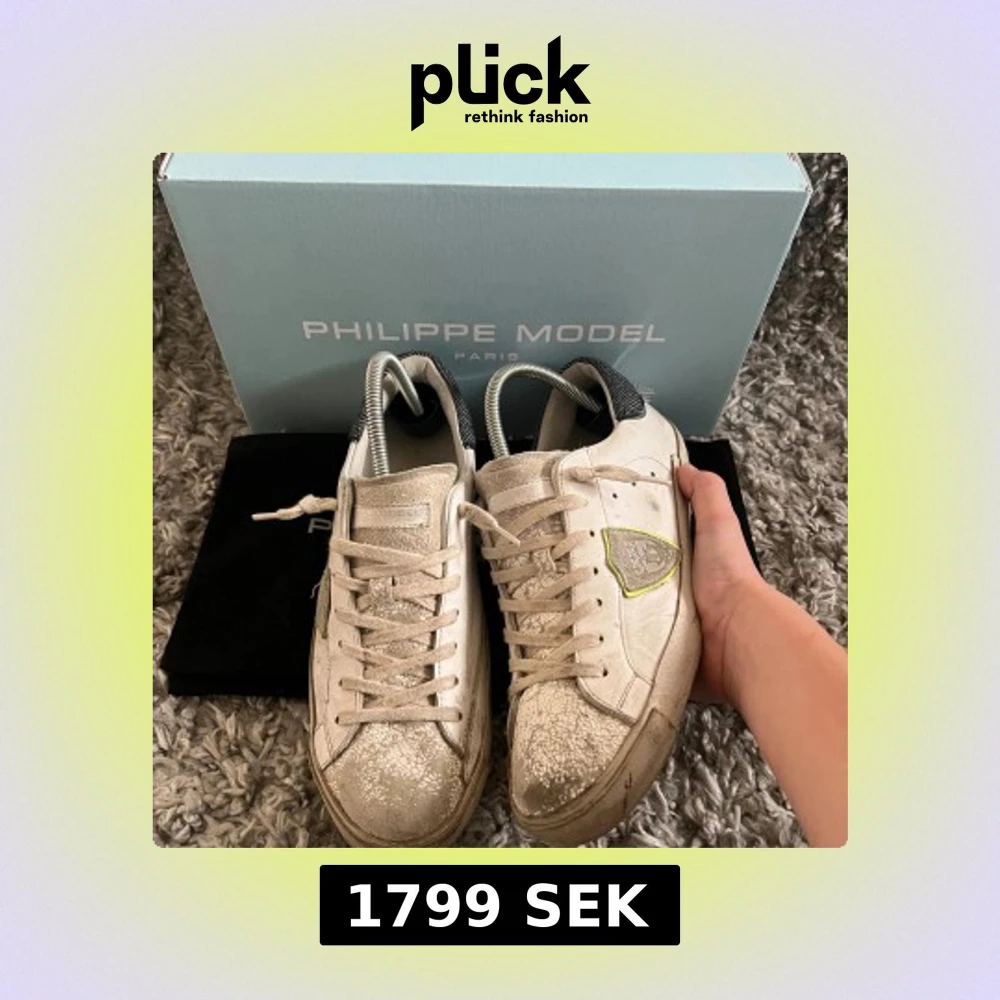 Snygga vita sneakers från Philippe Model med spräcklig textur på tån, grå mockadetaljer och en ikonisk sköld på sidan med gul kant. Skorna har snörning, platt sula och denimliknande detalj på hälen. Perfekta för dig som gillar en unik och trendig look.
