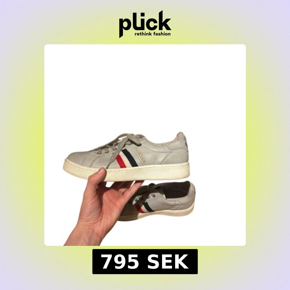 Säljer ett par gråa sneakers från Moncler med klassiska ränder i rött, vitt och blått på sidan. Skorna har snörning, rund tå och vit platt sula. Moncler-logga på hälen. Perfekta för dig som gillar stilrena och sportiga skor. Skorna är storlek 42.