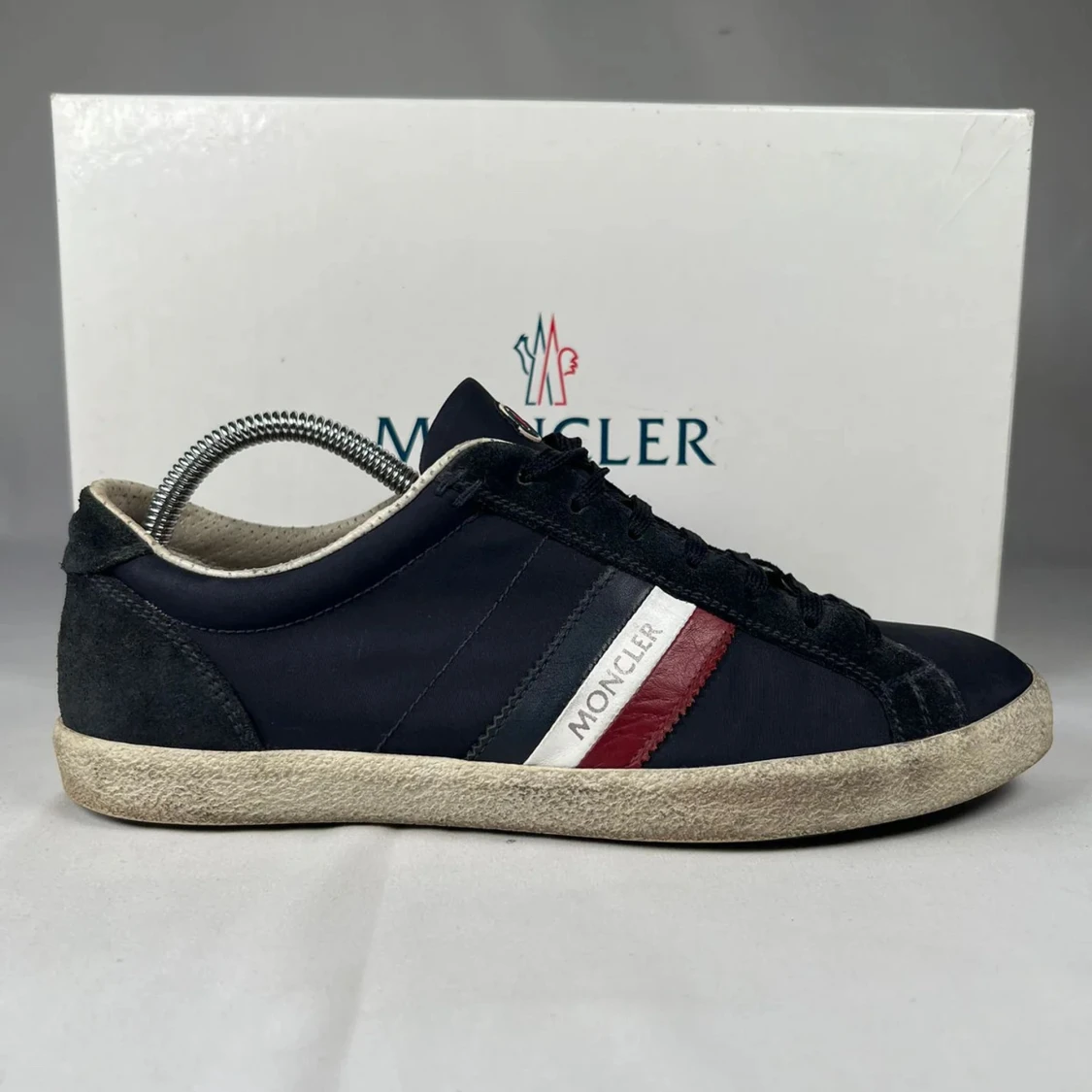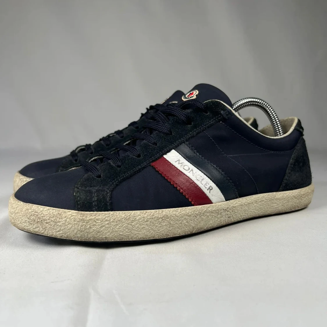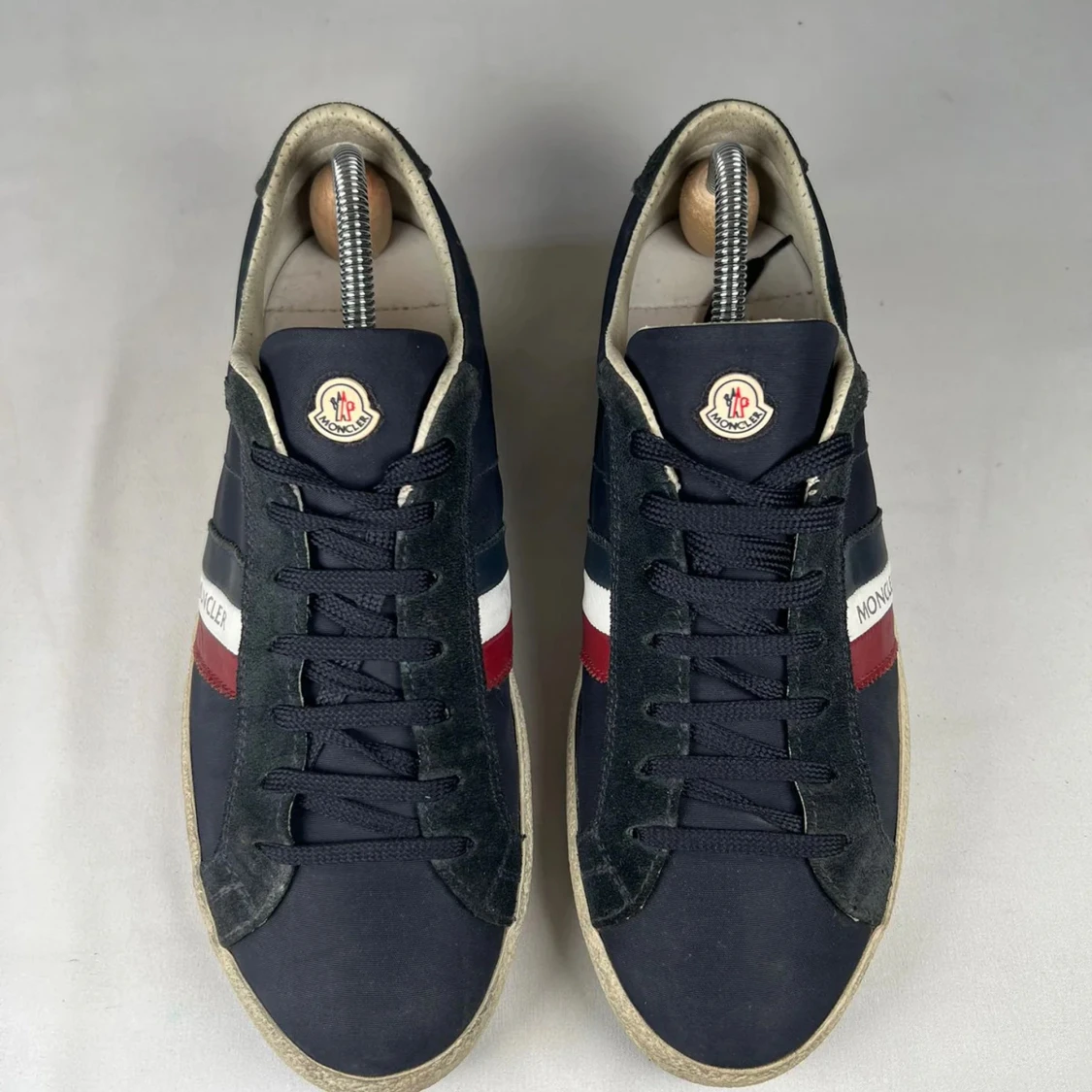 Snygga sneakers från Moncler i marinblått tyg och mocka med klassiska ränder i rött, vitt och blått på sidan. Skorna har rund tå, platt sula och snörning framtill. Moncler-logga på plösen och sidan ger en exklusiv vibe. Perfekta för dig som gillar stilrena och sportiga skor.
