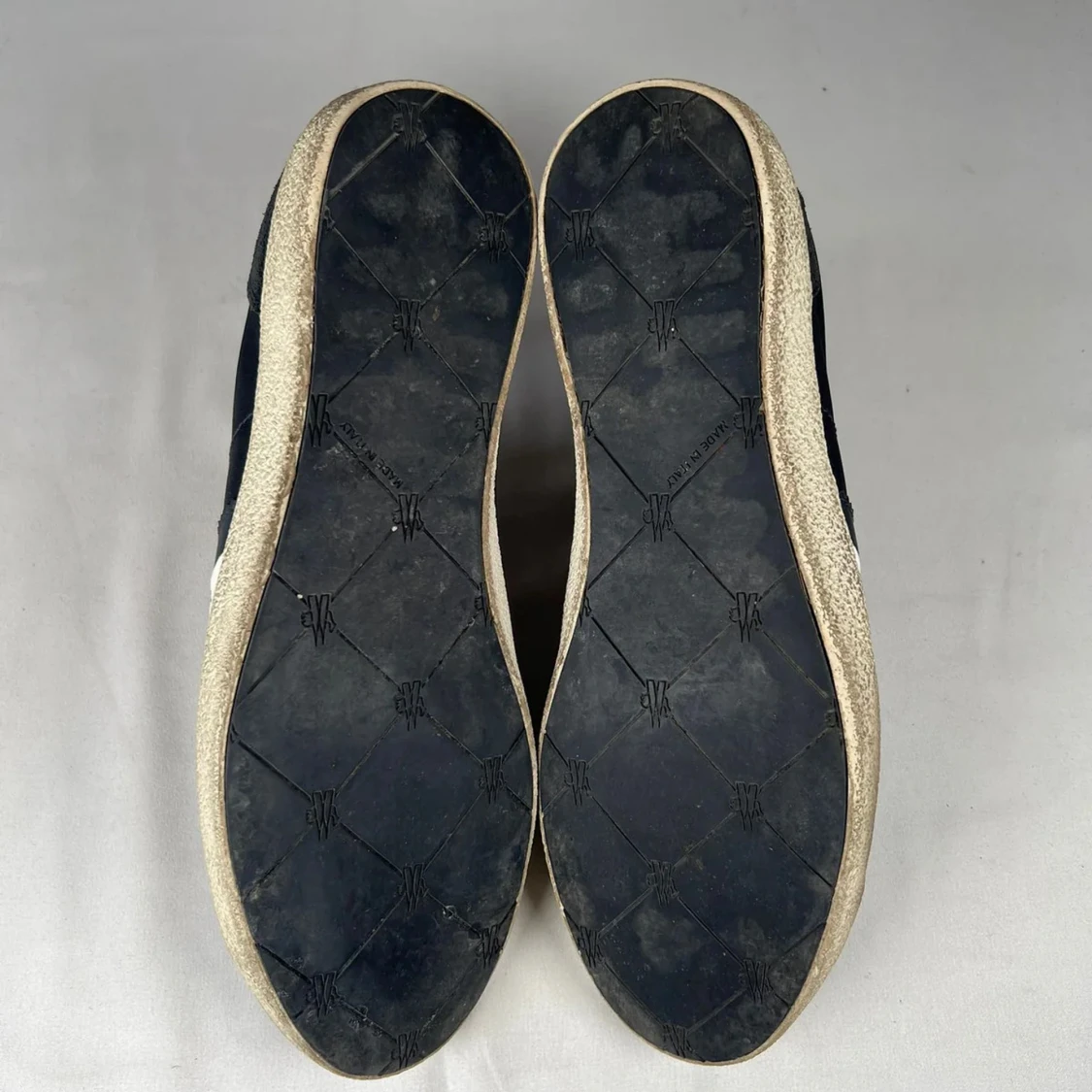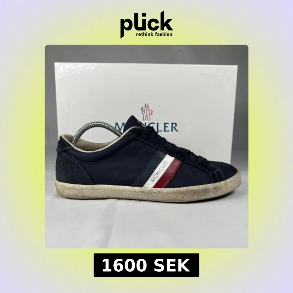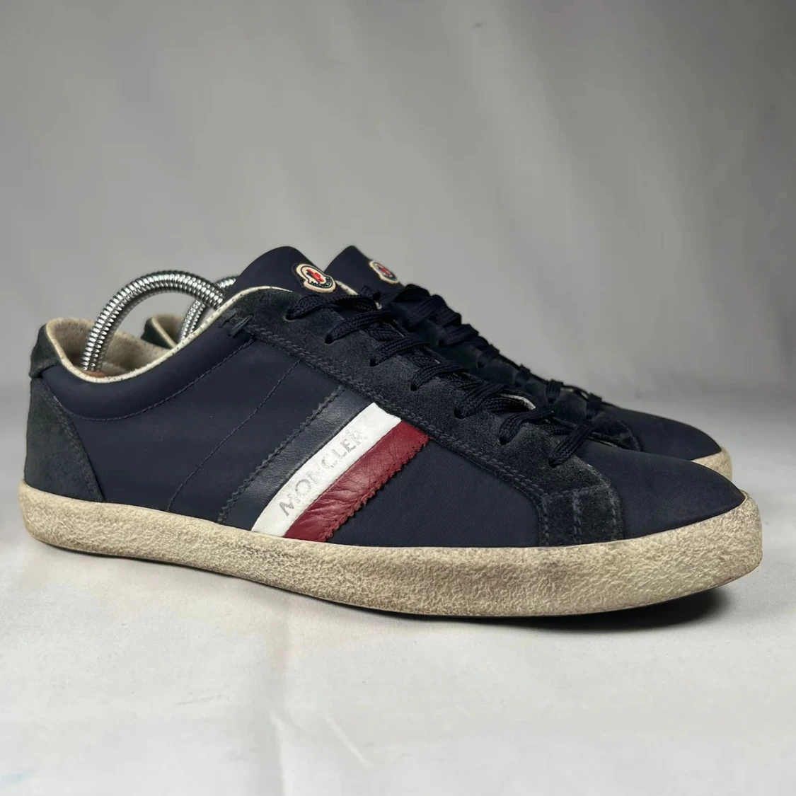 Snygga sneakers från Moncler i marinblått tyg och mocka med klassiska ränder i rött, vitt och blått på sidan. Skorna har rund tå, platt sula och snörning framtill. Moncler-logga på plösen och sidan ger en exklusiv vibe. Perfekta för dig som gillar stilrena och sportiga skor.