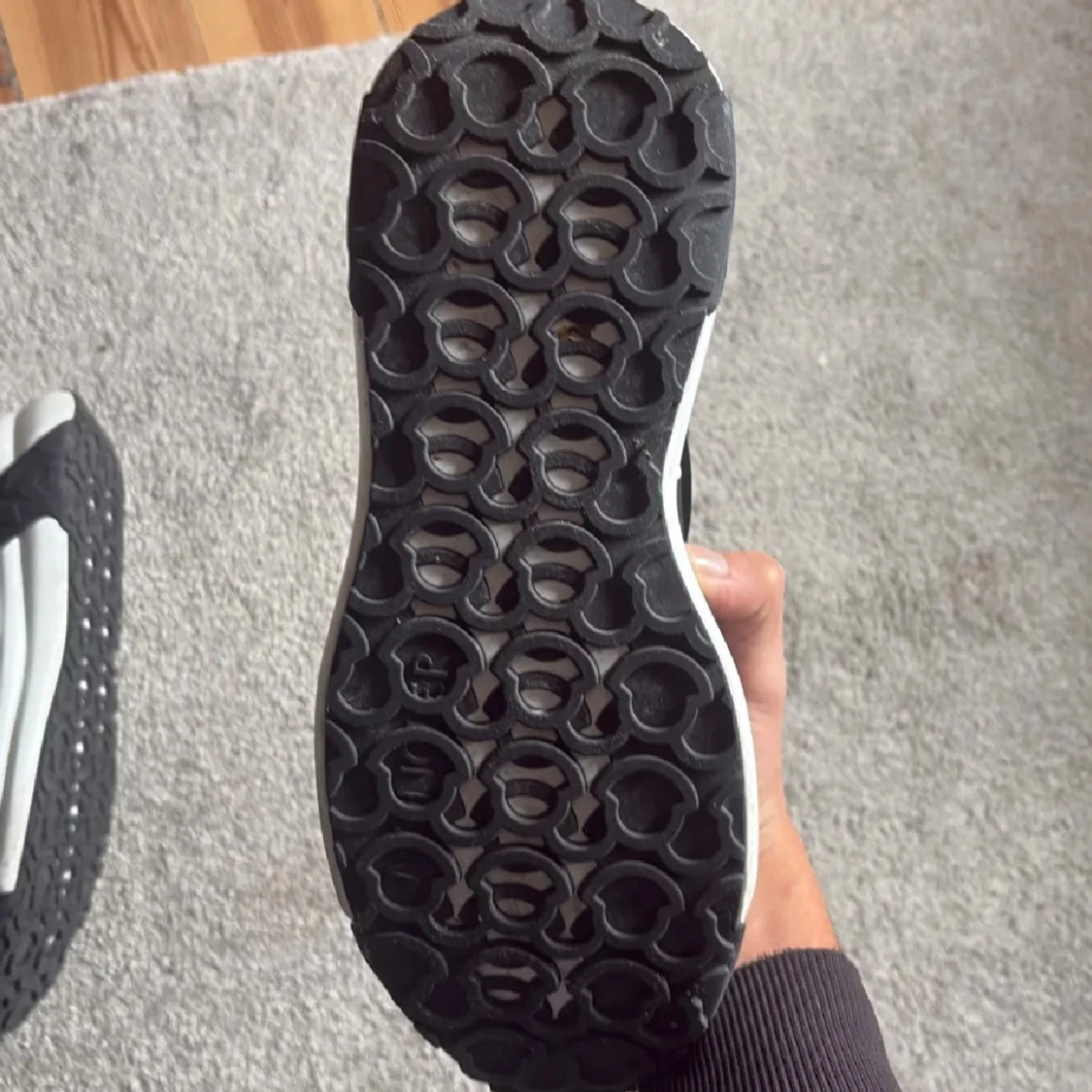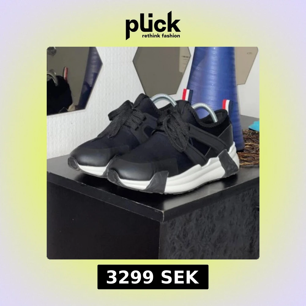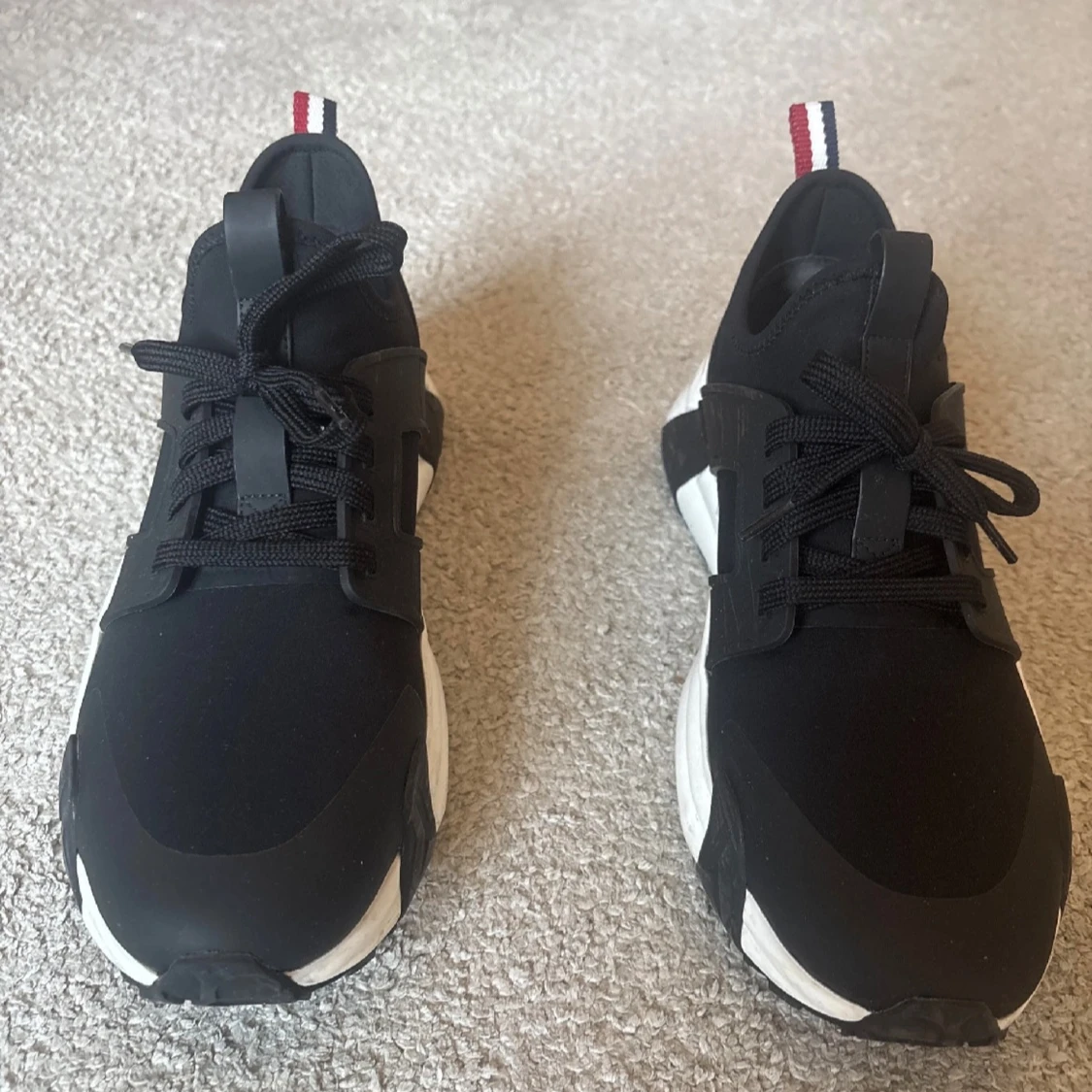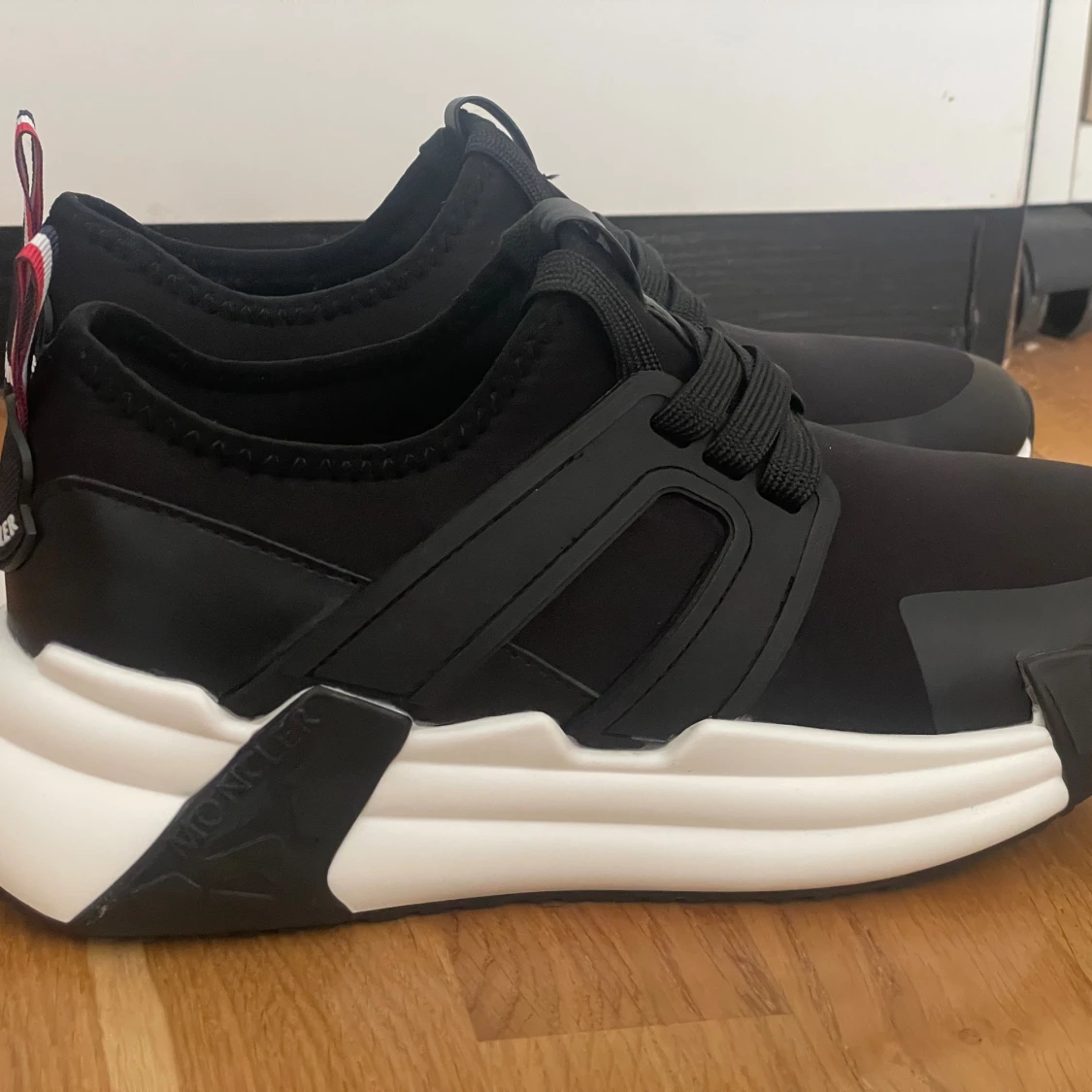 Snygga svarta sneakers från Moncler med vit platt sula och svarta snören. Skorna har en modern design med detaljer i syntet och textil, samt en röd, vit och blå flik bak. Yttersulan har ett unikt mönster för extra grepp. Perfekt för dig som gillar stilrena och sportiga skor.