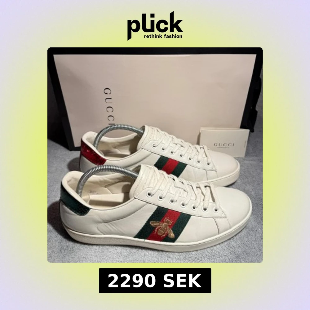 Klassiska Gucci Ace skor med ett bi - storleken är 44, och dem är i nyskick 10/10 - köpta för runt 4000kr, säljs för 2290kr - har kvitto - STEAL 🙌