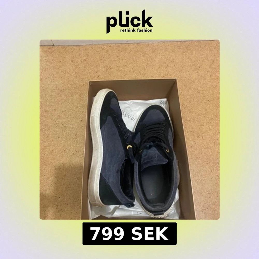 Snygga sneakers i svart och mörkblå mocka med vita sulor och svarta snören. Skorna har gulddetaljer vid snörningen och en klassisk rund tå. Perfekta för dig som gillar stilrena och bekväma skor med en modern touch.