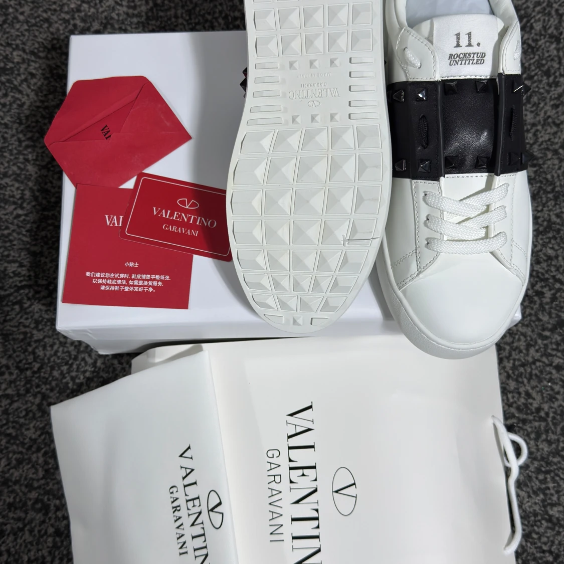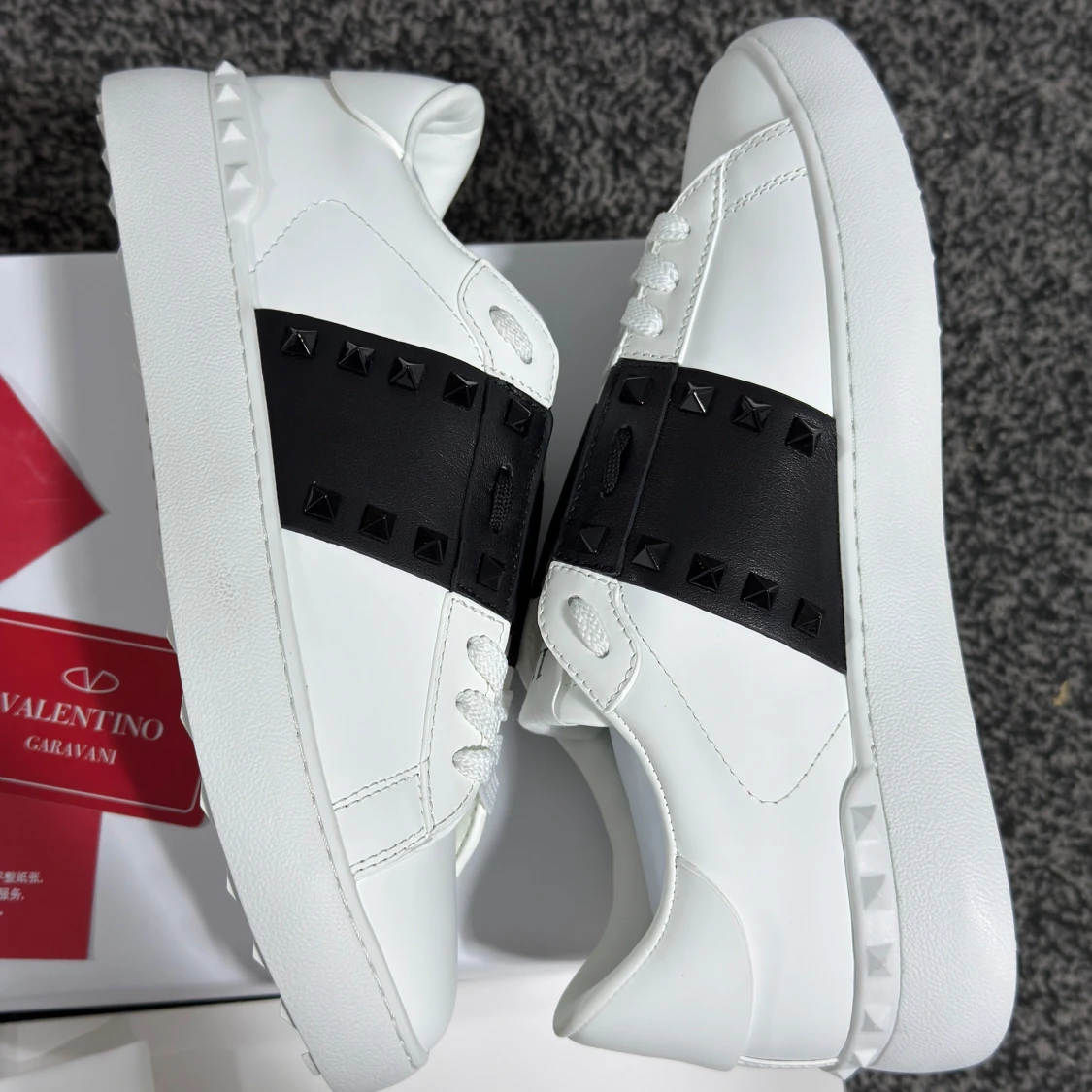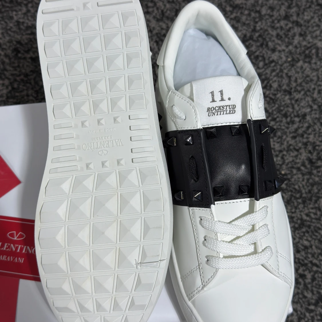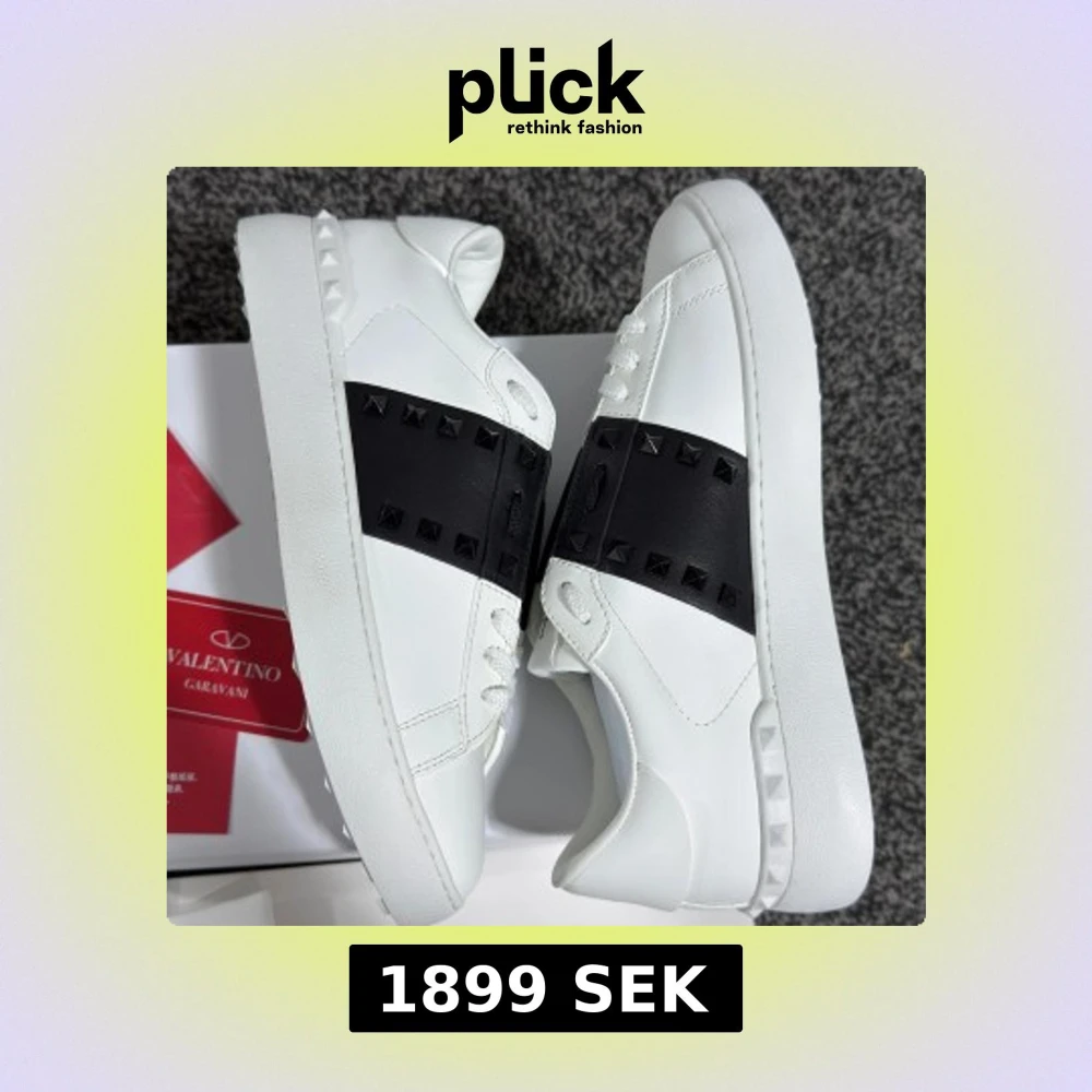 Säljer ett par vita Valentino Garavani sneakers med bred svart rem över vristen dekorerad med svarta nitar. Skorna har rund tå, platt sula och klassisk snörning. Märkeslogga på plösen och detaljerad sula. Perfekta för dig som gillar exklusiv streetstyle.