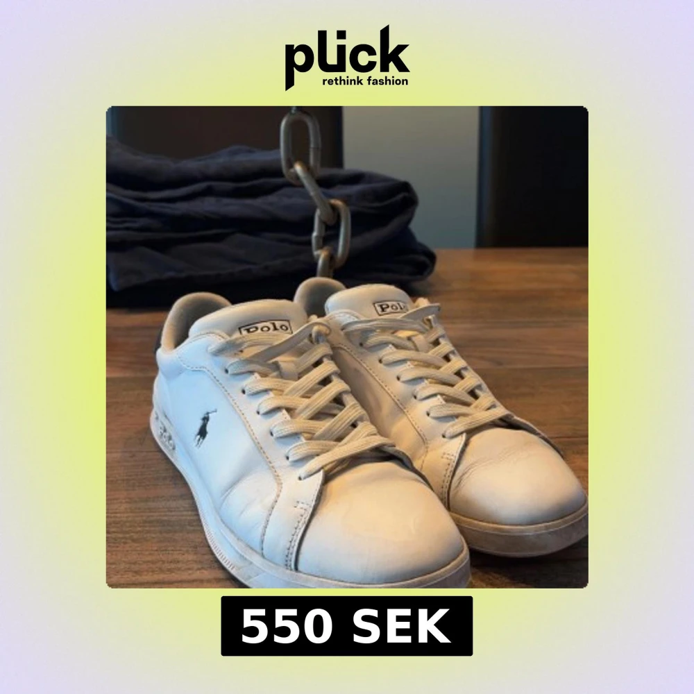 Säljer ett par klassiska vita sneakers från Polo Ralph Lauren med svart detalj på hälen och logga på sidan. Skorna har snörning och rund tå, perfekt för en stilren look. Märket syns tydligt både på sidan och baksidan av skorna.