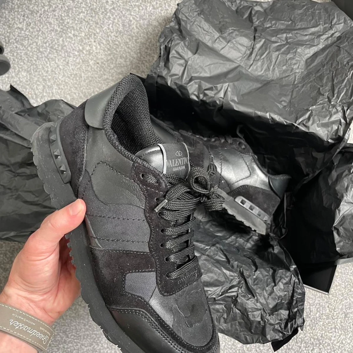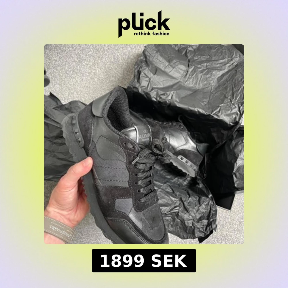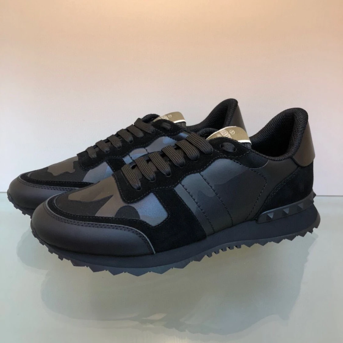 Snygga svarta Valentino Garavani Rockrunner sneakers med coola camouflagedetaljer. Skorna har en mix av skinn, mocka och textil, samt ikoniska nitar på hälen. Perfekta för dig som vill ha en lyxig och edgy look till vardags. Klassisk snörning och bekväm platt sula.