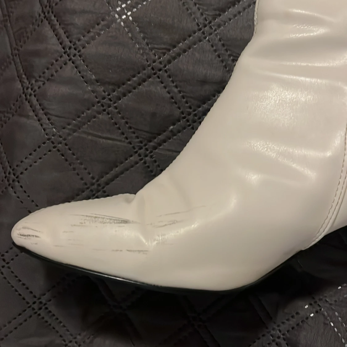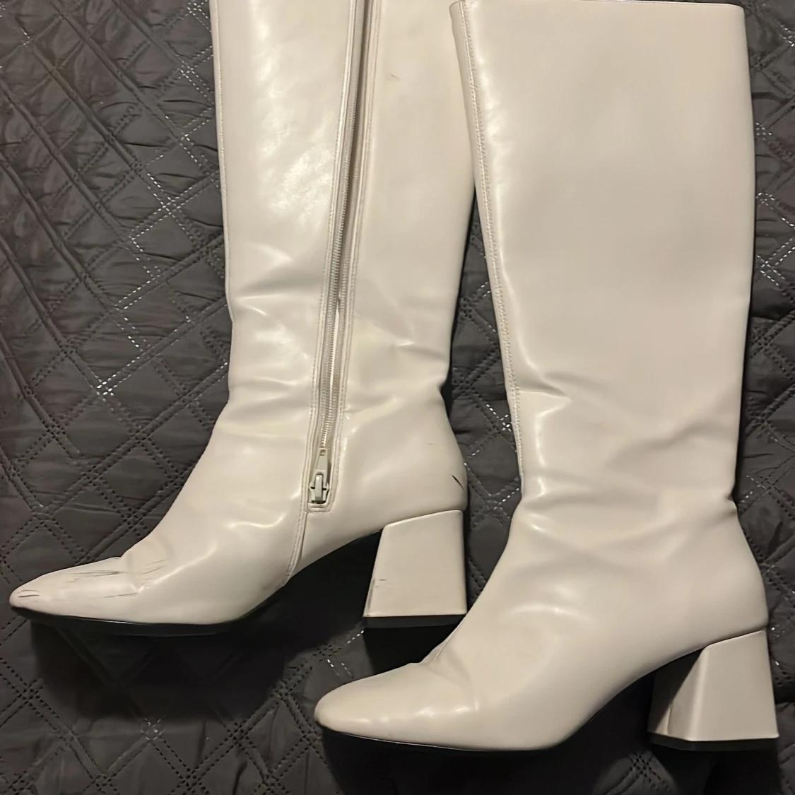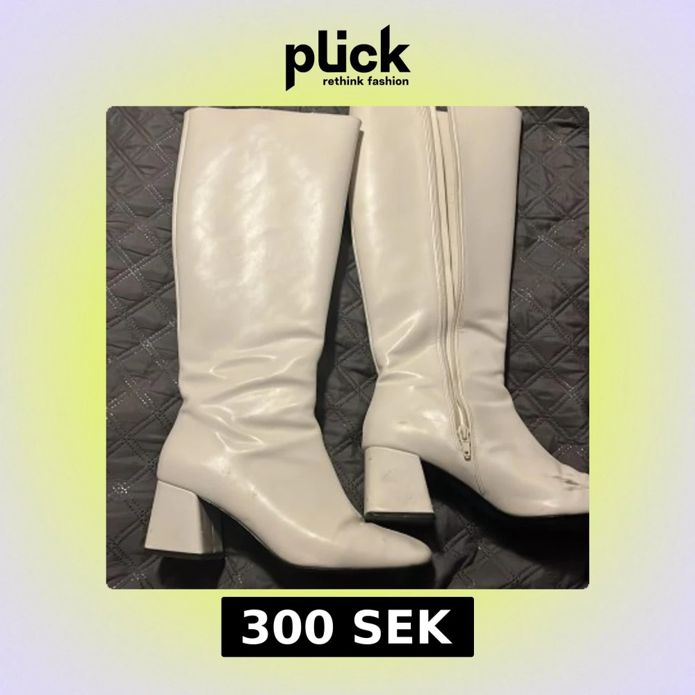 Snygga vita stövlar med klack och dragkedja på sidan. De har en spetsig tå och är perfekta för att ge en stilren look. Passar bra till olika outfits och tillfällen.