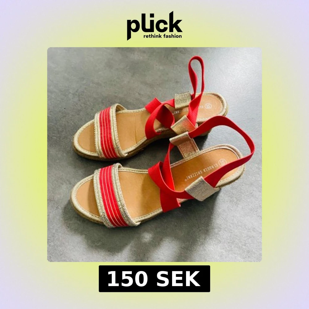 Snygga sandaler med mörk rosa och guldig rem, elastiska band och flätad kilklack. Öppen tå och bekväm passform, perfekta för varma dagar. Sula i naturfärgat material och detaljer i syntet. Skorna är i nyskick, möjligtvis använda en gång.