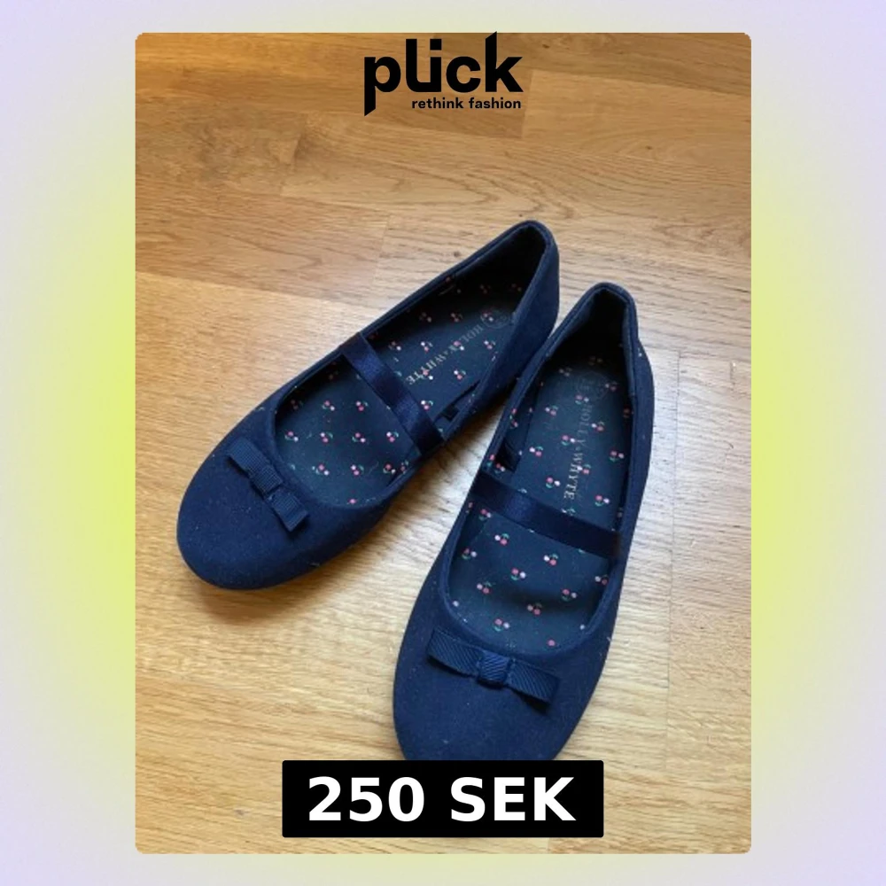 Snygga mörkblå ballerinaskor från Holly & Whyte med rund tå och platt sula. Skorna har en söt rosett framtill och ett band över foten. Insidan är dekorerad med ett gulligt körsbärsmönster i rosa och grönt. Yttermaterialet är i textil och sulan i syntet.