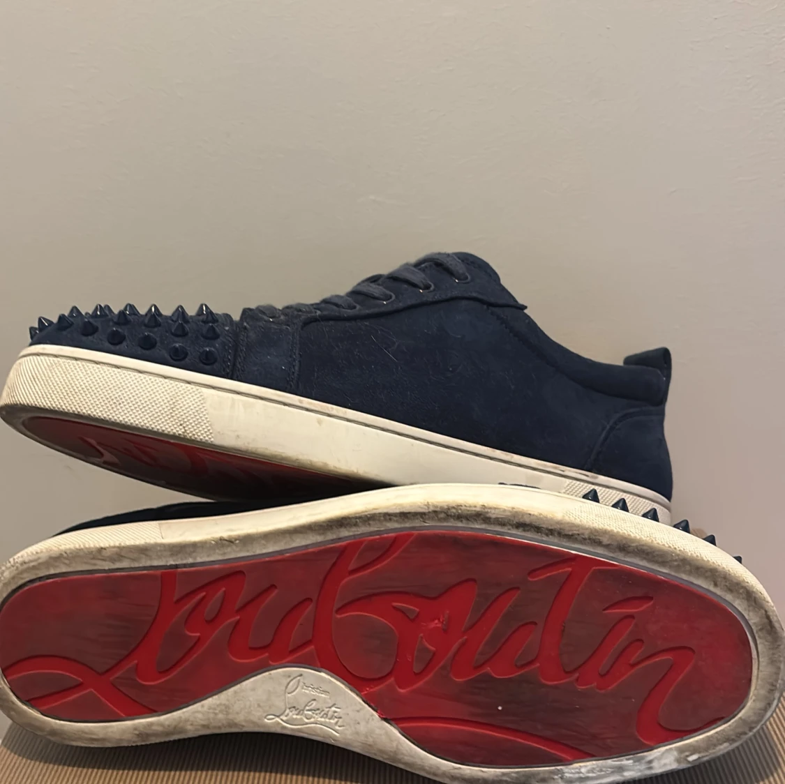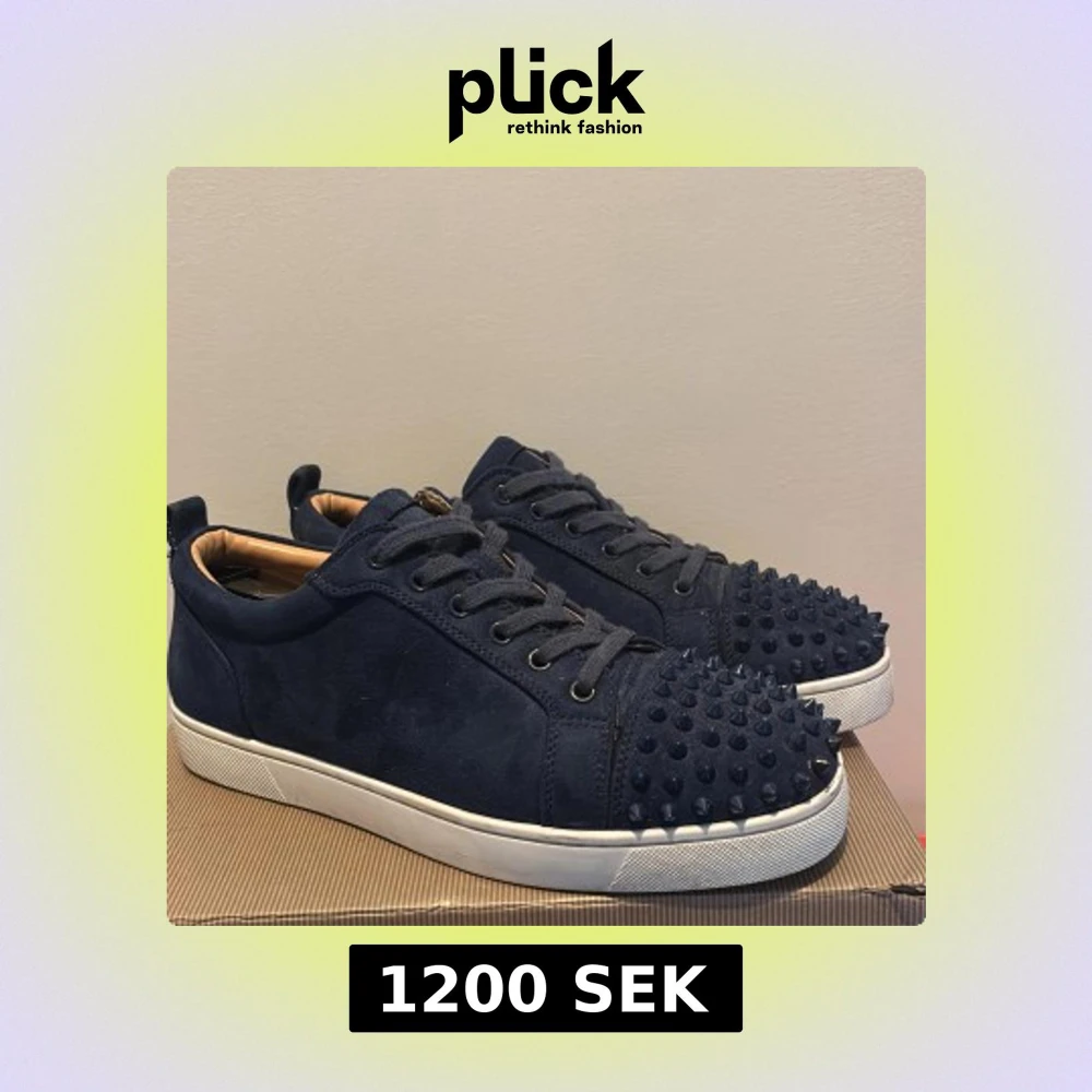 Säljer ett par mörkblå sneakers från Christian Louboutin med coola nitar på tån och klassisk röd sula. Skorna har snörning, rund tå och är tillverkade i mocka med vit platt sula. Perfekt för dig som vill sticka ut med exklusiv design och edgy detaljer.
