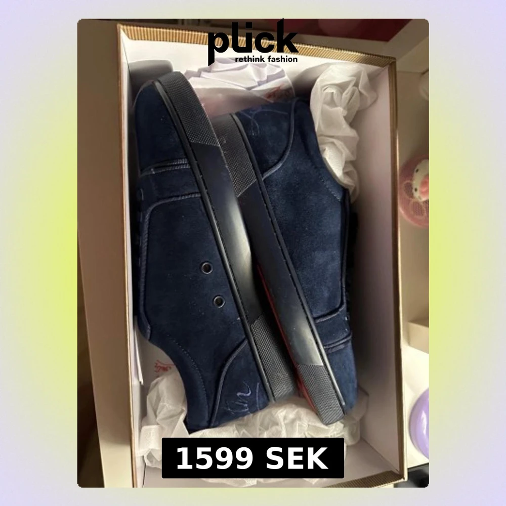 Snygga mörkblå sneakers från Christian Louboutin i mjuk mocka med klassisk röd signatursula. Skorna har rund tå, platt sula och snörning framtill. Insidan är beige och de kommer med originalförpackning och certifikat. Perfekt för dig som gillar exklusiva detaljer.