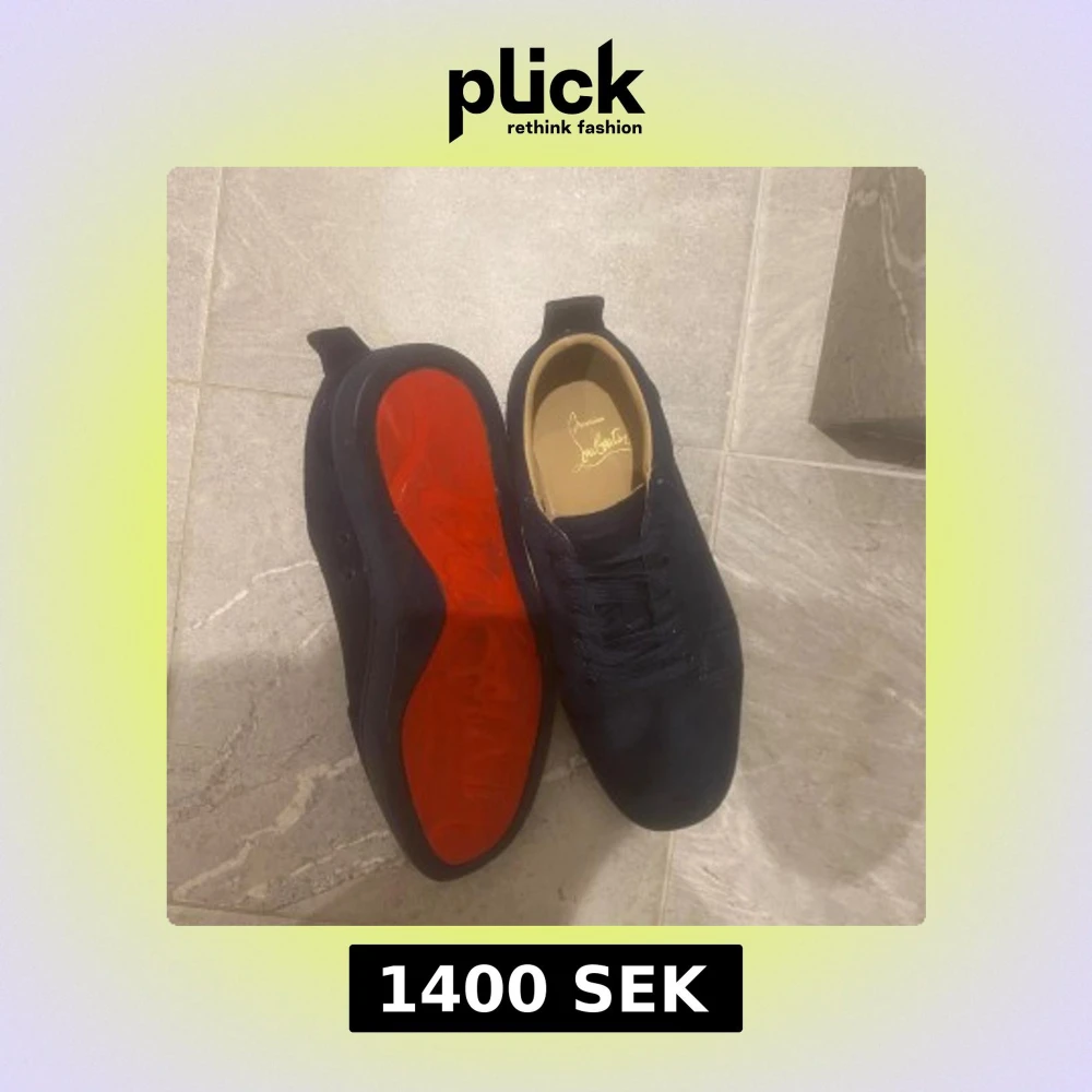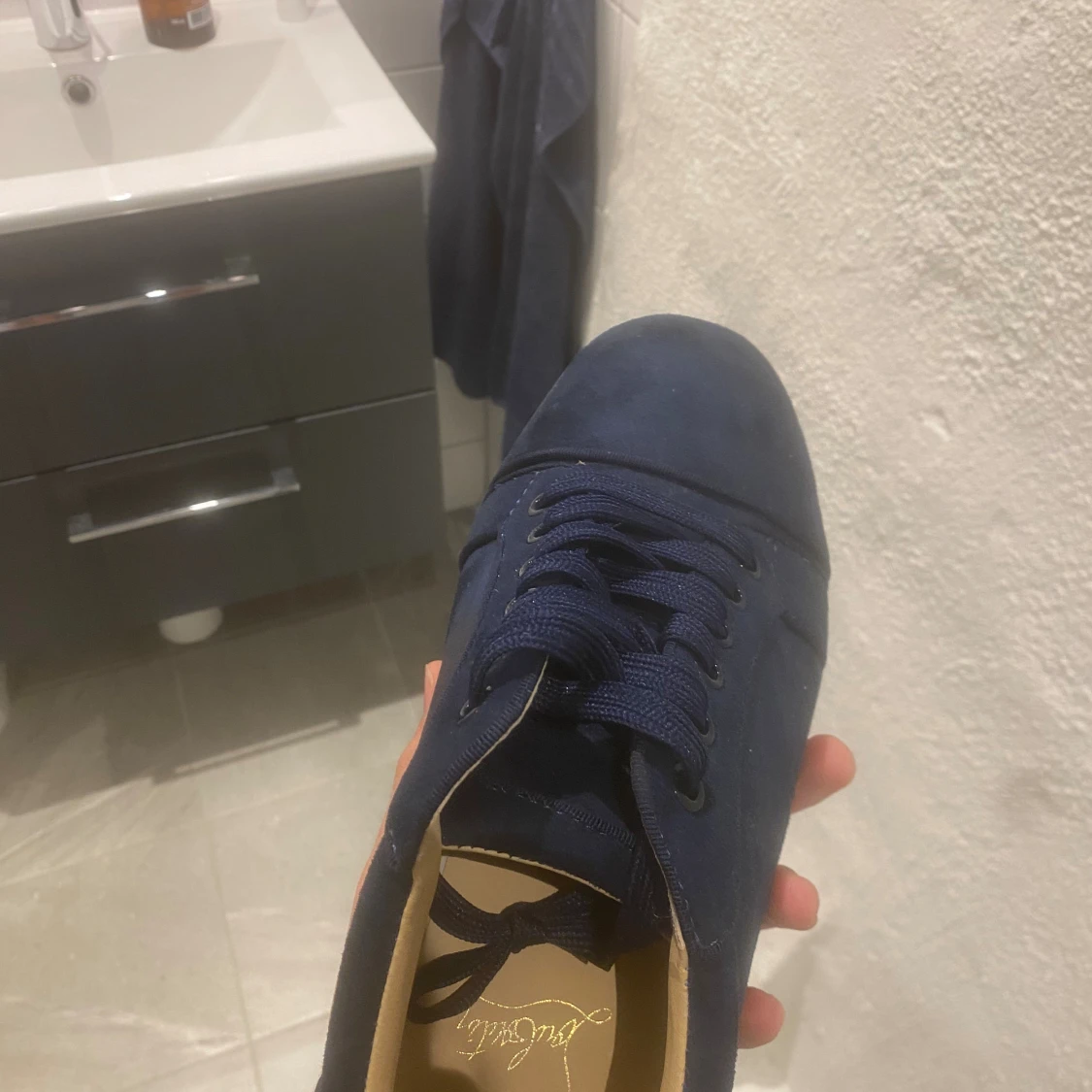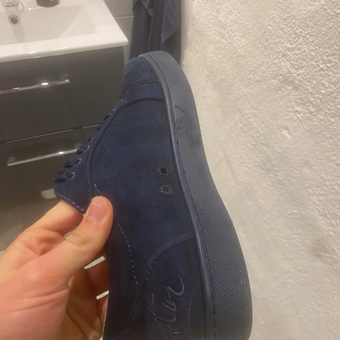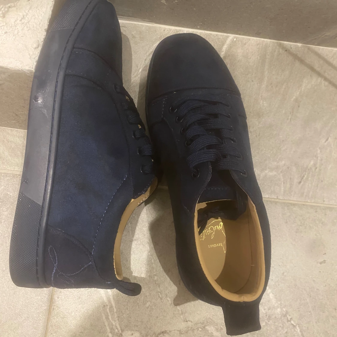 Säljer ett par mörkblå sneakers från Christian Louboutin i mocka med klassisk röd sula. Skorna har rund tå, platt sula och snörning. Insidan är beige och märkt med Louboutins logga. Perfekta för dig som vill sticka ut med exklusiva detaljer.