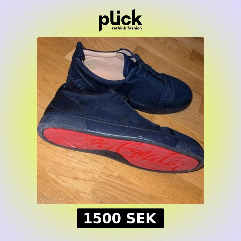 Snygga mörkblå sneakers från Christian Louboutin i mjuk mocka med klassisk röd sula och rund tå. Skorna har snörning och diskreta detaljer, samt ljusbeige innersida. Perfekt för dig som vill sticka ut med exklusiv stil.