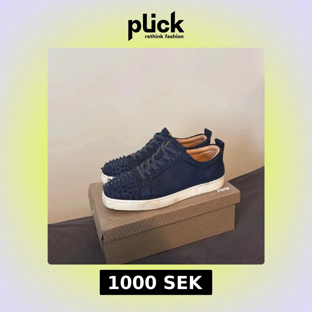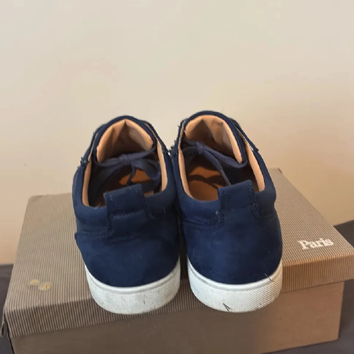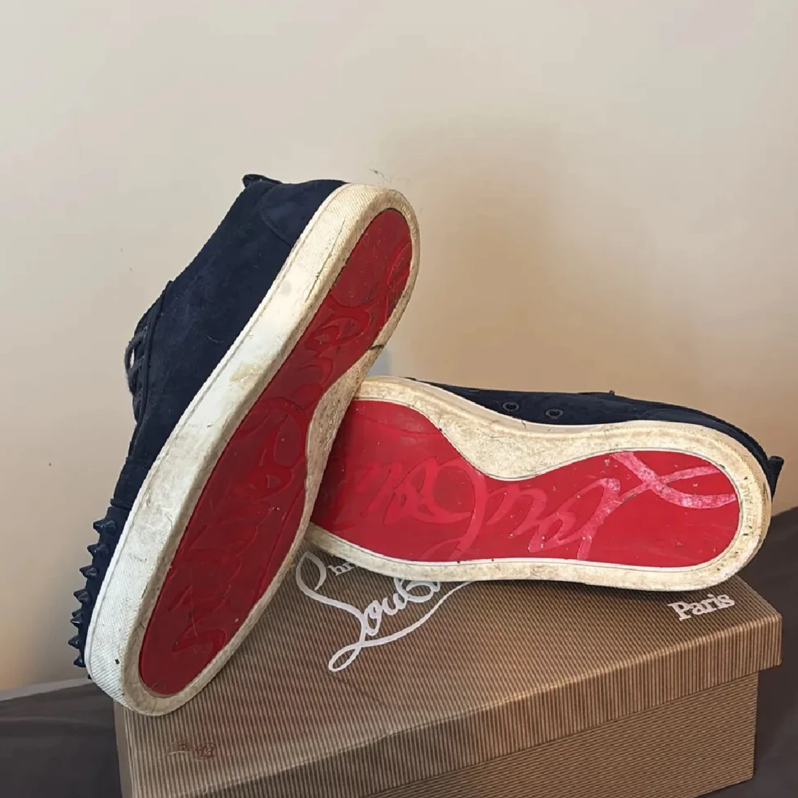 Säljer ett par mörkblå sneakers från Christian Louboutin med coola nitar på tån och klassisk röd sula. Skorna är gjorda i mocka och har snörning samt vit platt sula. Insidan är beige och de har en rund tå. Perfekt för dig som vill sticka ut med din stil.