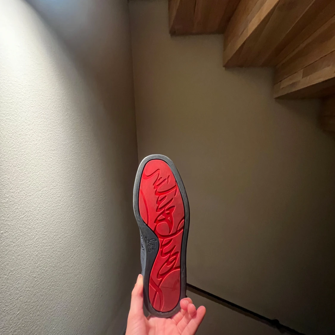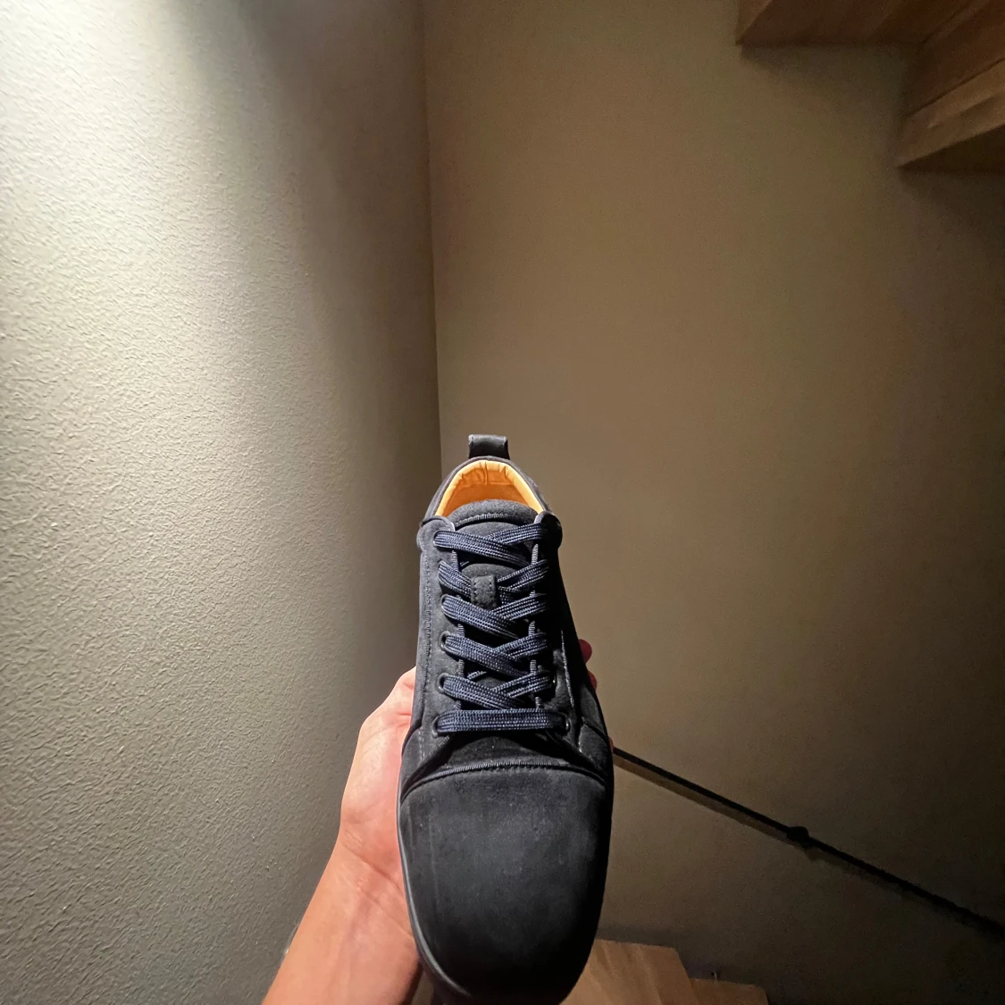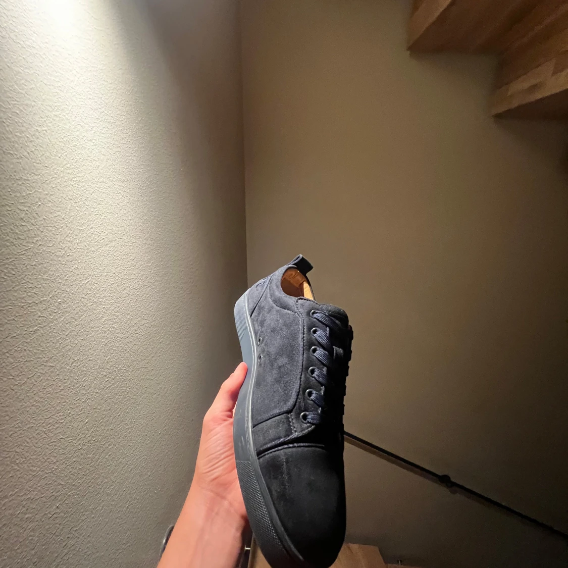 Snygga navysneakers från Christian Louboutin i mjuk mocka med klassisk rund tå och platt sula. Insidan är beige och yttersulan har den ikoniska röda färgen med Louboutin-loggan. Skorna har snörning och en stilren, minimalistisk look.9,5/10 i skick änvända minst 5 gånger, storlek 43/44.Skriv vid minsta tanke, och priset är inte hugget i sten☺️