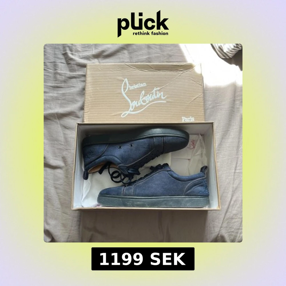 Snygga mörkblå sneakers från Christian Louboutin i mjuk mocka med klassisk röd sula och diskret broderad logga på hälen. Skorna har rund tå, snörning. Kommer med originalkartong och dustbag. Och har släppt lite i sömen på sista bilden som man ser.