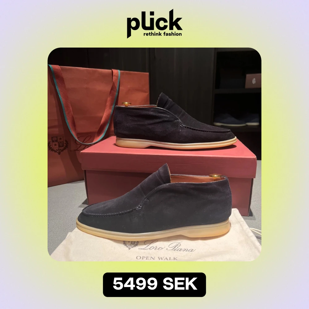 Säljer ett par eleganta svarta loafers i mocka från Loro Piana. De har en stilren design med ljus sula och är perfekta för både vardag och fest. Skorna är i mycket bra skick och kommer med originalförpackning.