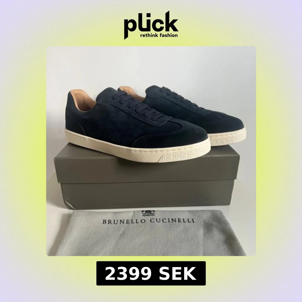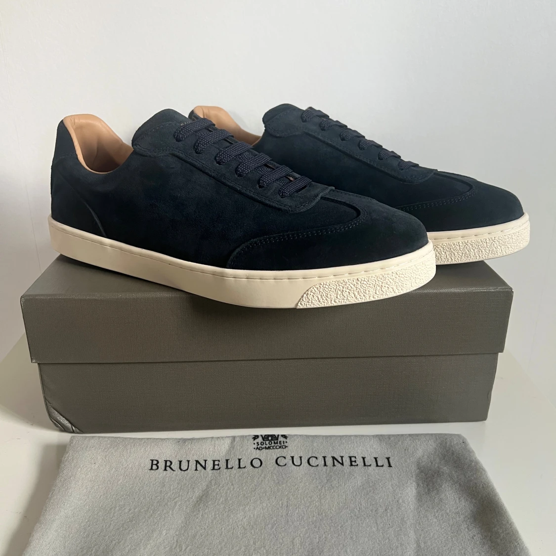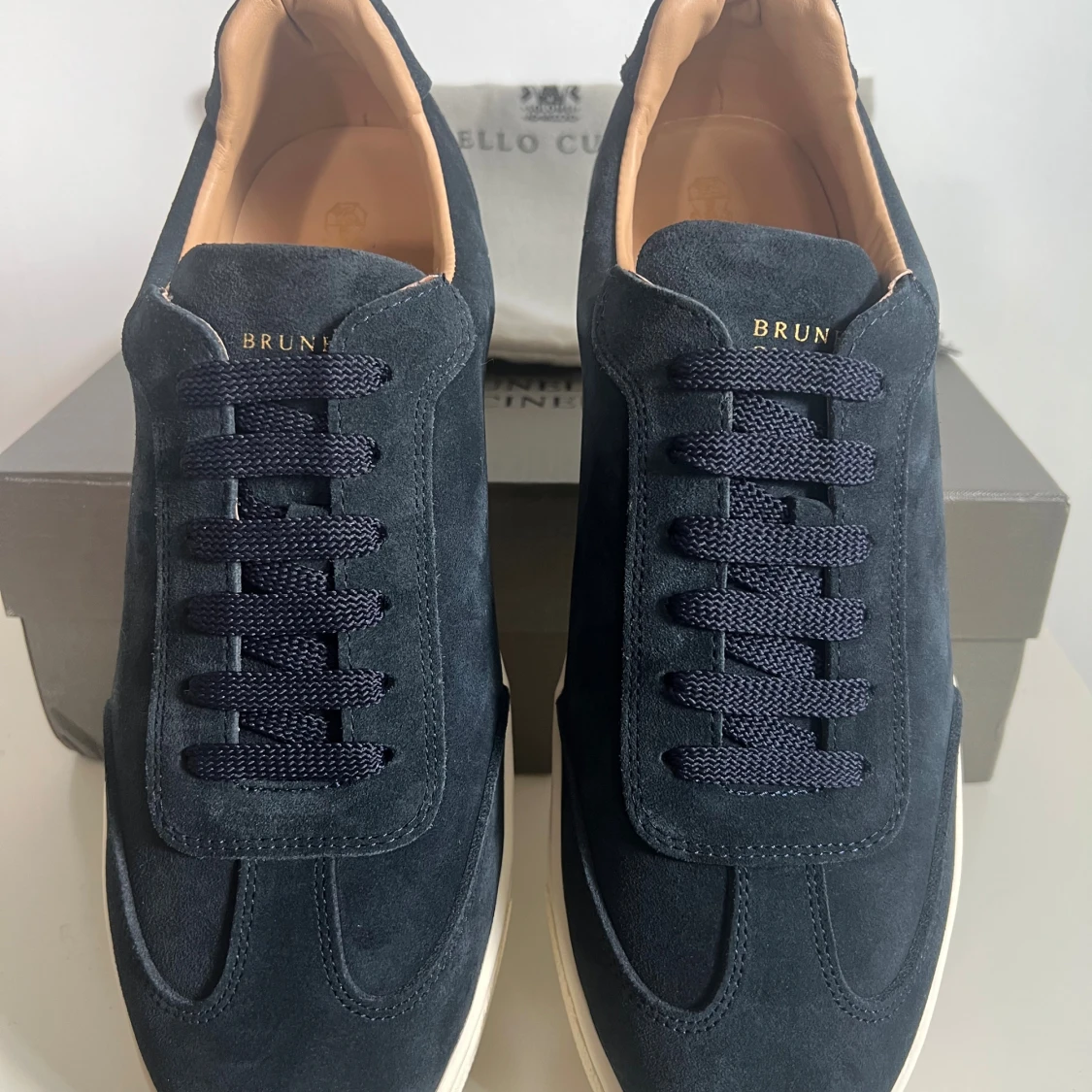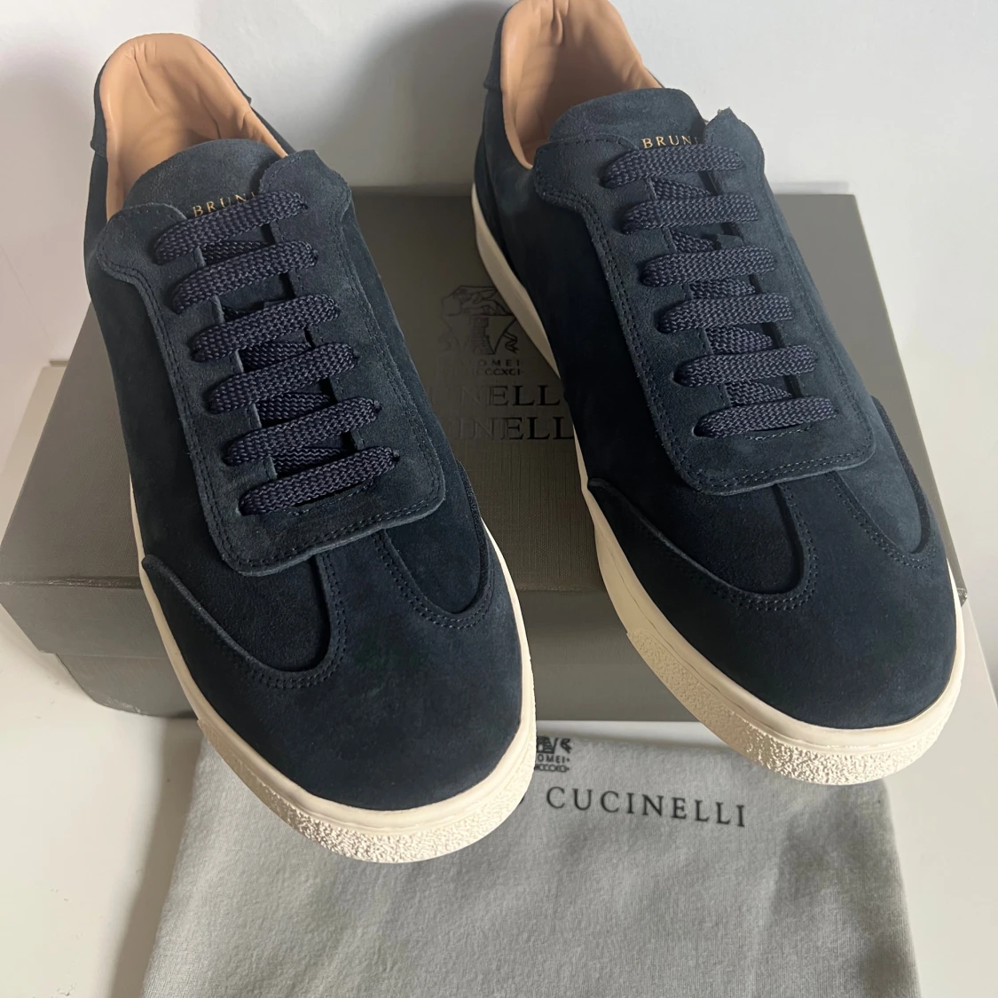 Snygga mörkblå sneakers från Brunello Cucinelli i lyxig mocka med vita platta sulor och mörkblå snörning. Skorna har en stilren och minimalistisk design med rund tå och diskret branding på plösen. Perfekta för dig som gillar exklusiva och tidlösa sneakers.