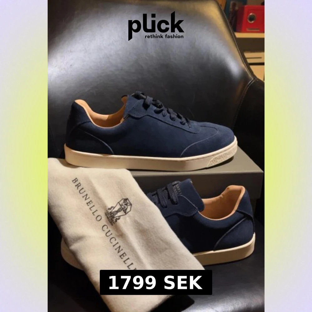 Snygga mörkblå sneakers från Brunello Cucinelli i mocka med vita, platta gummisulor och klassisk snörning. Insidan är ljusbeige och skorna har en stilren, minimalistisk design. Perfekta för dig som gillar exklusiva och tidlösa sneakers.1:1