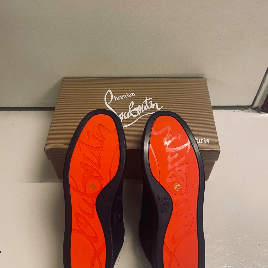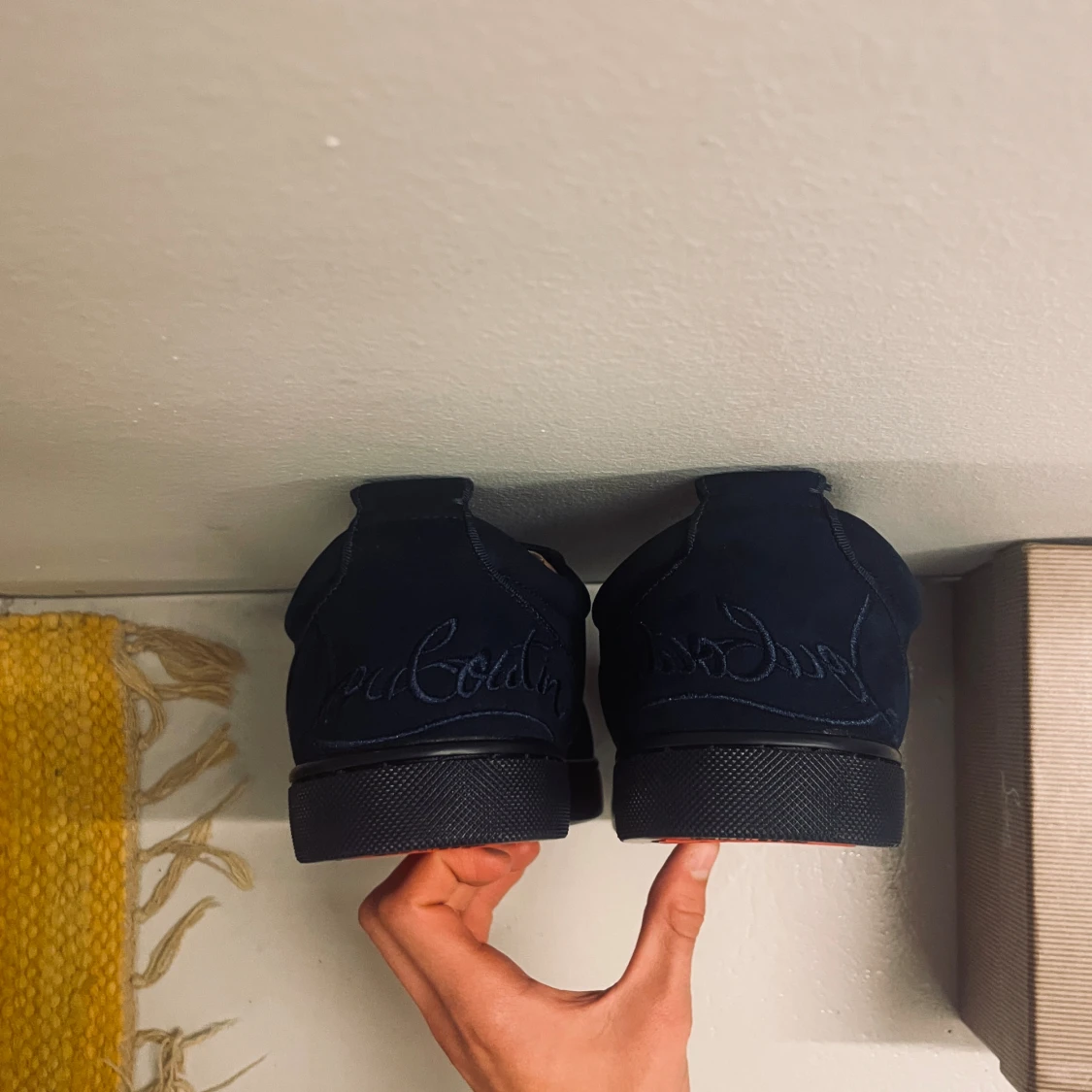 Snygga mörkblå sneakers från Christian Louboutin med klassisk röd sula och diskret broderad logga på hälen. Skorna har rund tå, platt sula och snörning. Utsidan är i mocka och insidan i skinn för extra komfort. Perfekt för dig som vill sticka ut med exklusiv stil.