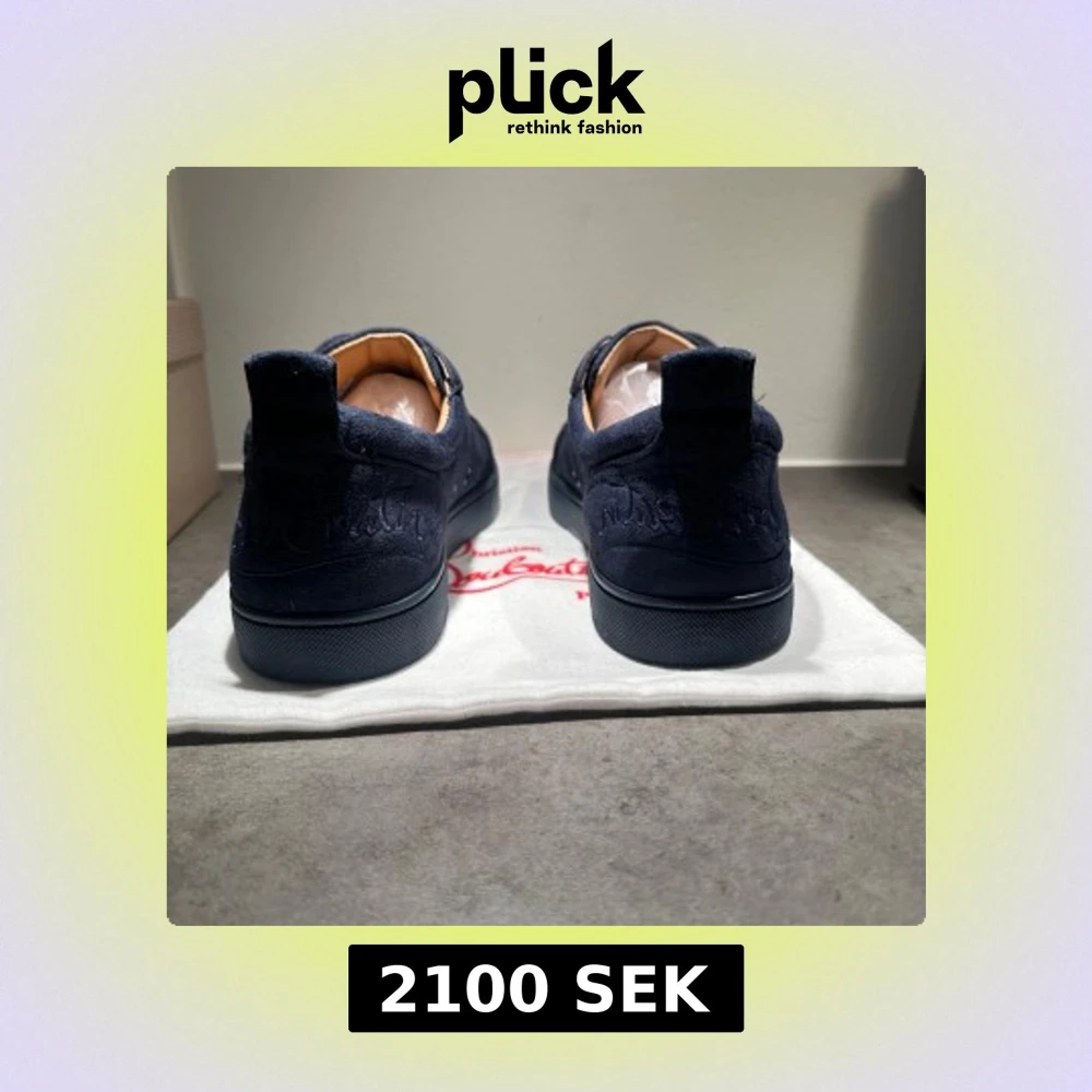 Snygga mörkblå sneakers i mocka från Christian Louboutin med den ikoniska röda sulan. Skorna har snörning och en stilren design som passar perfekt för en trendig look. Skick: 9.5/10 ✨ Använda 1-2 gånger. De är storlek 42 men de passar 41 också.