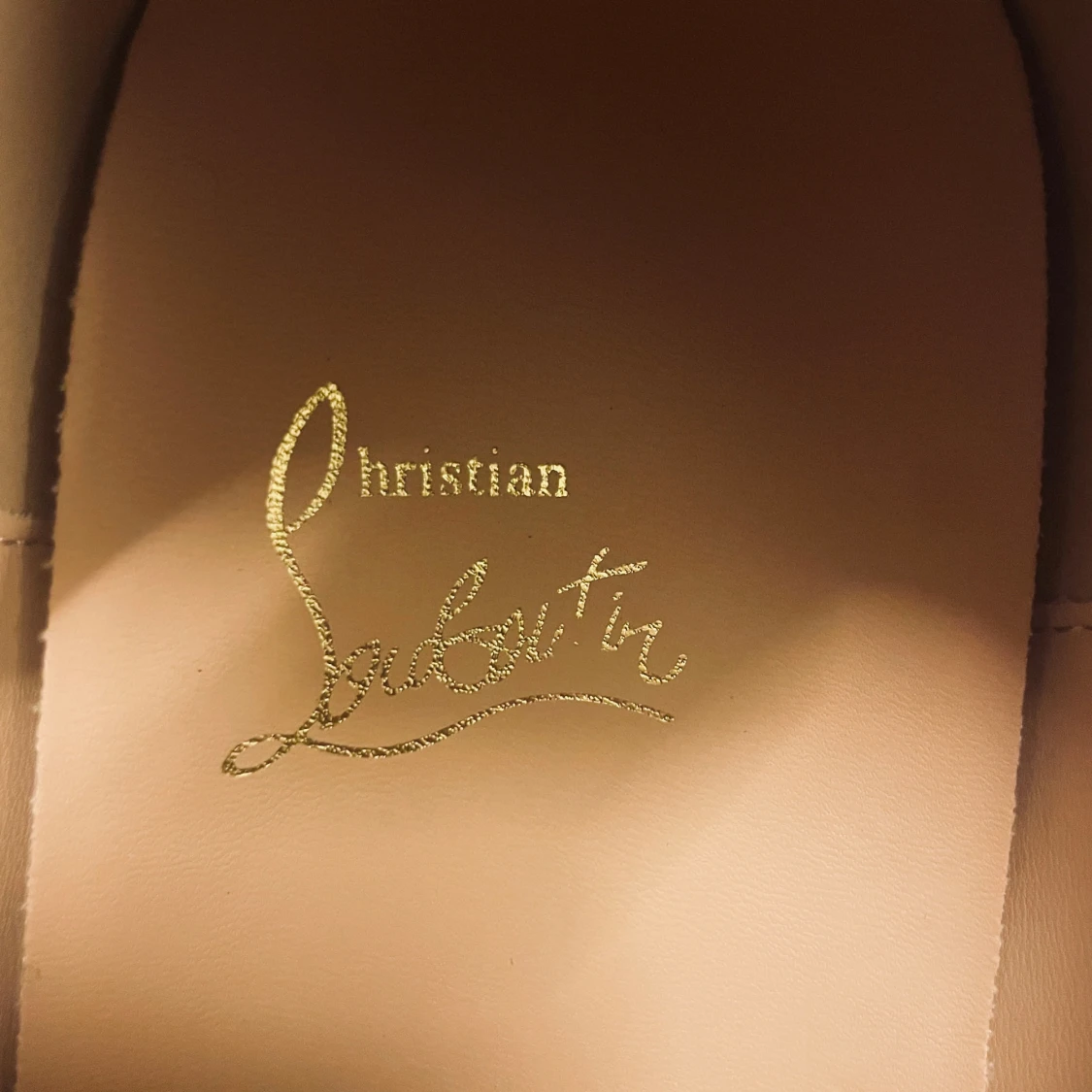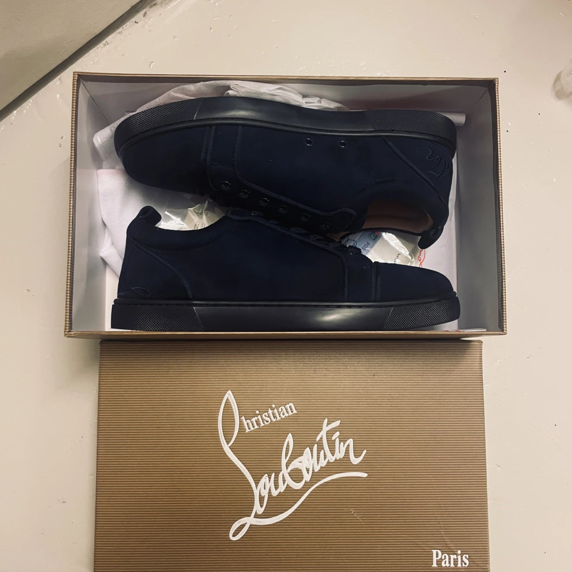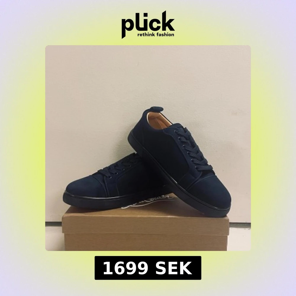 Snygga mörkblå sneakers från Christian Louboutin med klassisk röd sula och diskret logga på hälen. Skorna har snörning, rund tå och är tillverkade i mocka med detaljer i skinn. Perfekta för dig som vill ha en clean och lyxig look.