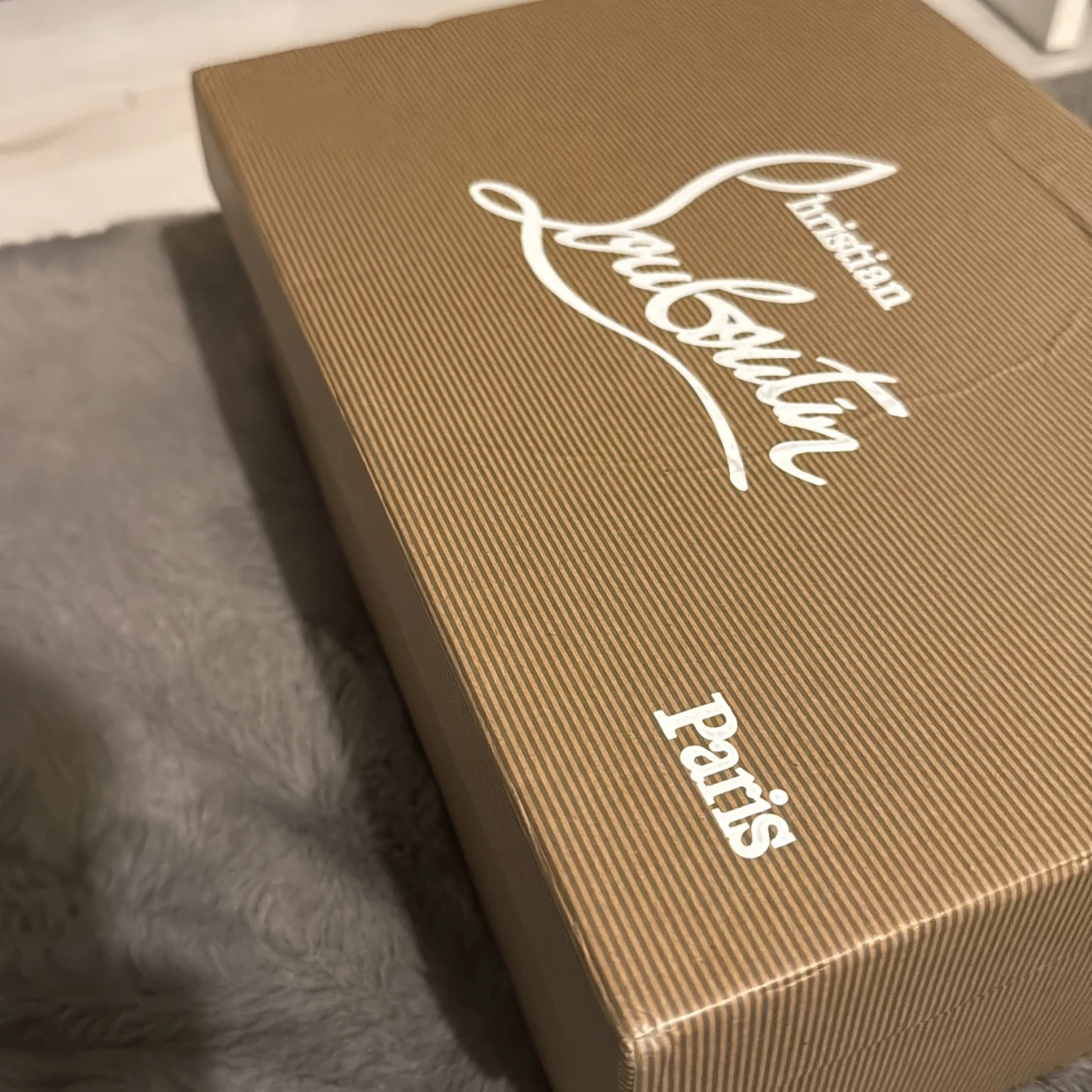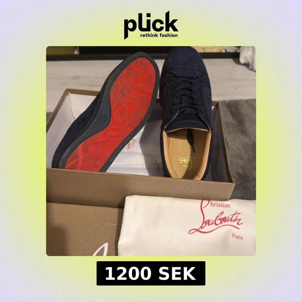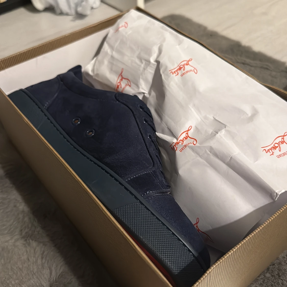 Snygga mörkblå sneakers från Christian Louboutin i mocka med klassisk röd sula. Skorna har rund tå, snörning och diskret broderad logga på sidan. Insidan är ljusbeige och sulan är platt. Kommer med originalkartong och dustbag.