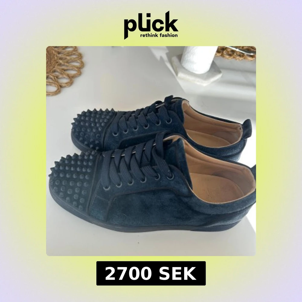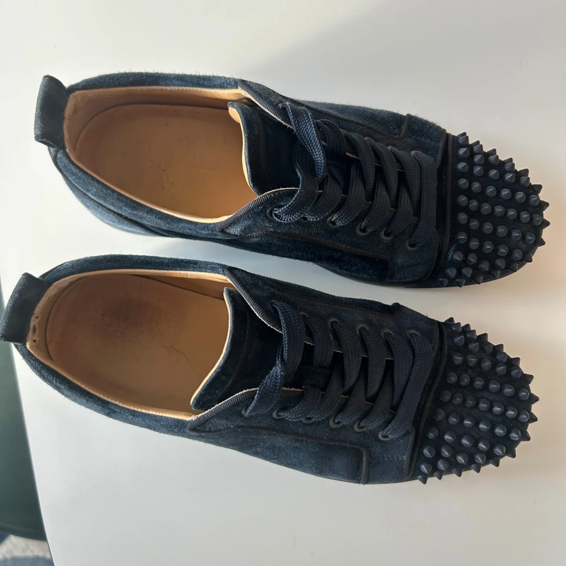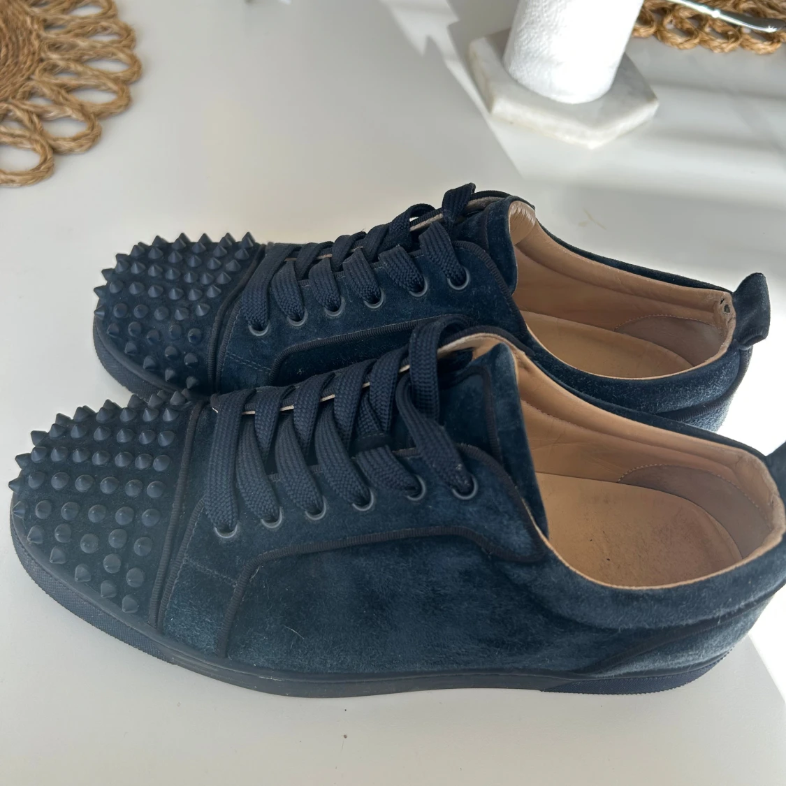 Säljer ett par mörkblå sneakers i mocka från Christian Louboutin med röda sulor och mörkblå nitar på tån. Skorna har snörning och rund tå, samt läderfoder. Skorna är lätt slitna men i väldigt bra skick. Storlek 43. 42 fransk storlek